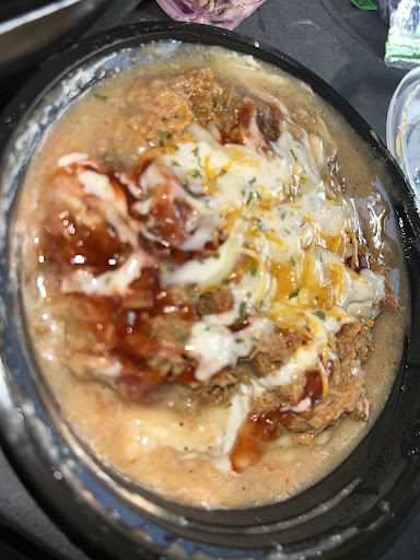 DETAILED REVIEW: I walked in and the door is very close to the drive thru exit and I think it can become an issue especially if it’s a busy day . Upon walking in I was politely greeted by a young lady and she had the best personality ! Very upbeat and respectful. Then she suggested items for me to try which were popular and that made me feel comfortable. I ordered and noticed that my food was being made fresh , which I loved . When my order was done a nice young man brought my food to me and I was given a Cole slaw to try . I had absolutely the best experience. The portion sizes were perfect . I got the pulled pork mashed potato bowl and the beef sauce loaded fries . My only things to “complain” about was the fact that the mashed potatoes did seem like they came from a box and weren’t freshly made from potatoes . I will say, I was thinking this place would be more so a toppings style place where you have options to add to your mashed potato bowl but it’s not that . Overall this was a nice place and I’ll be back in the future . I just wish the mashed potatoes weren’t boxed !! Ughh The prices are great for the portion size especially in this economy.