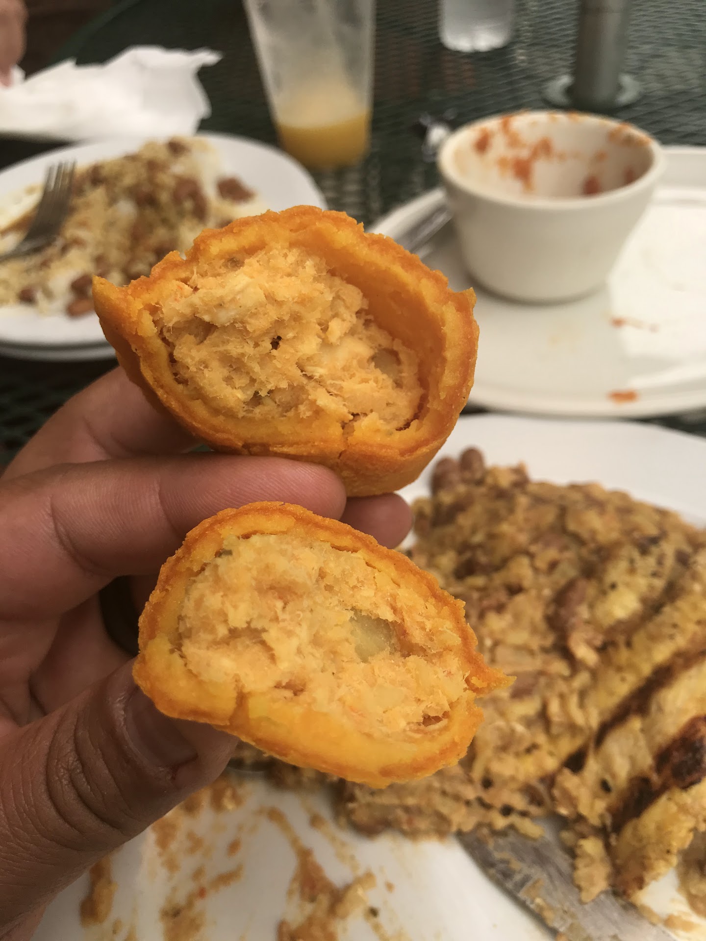 I decided on their “calentado carne,” which was a flavourful serving of scrambled eggs and veggies with a side of truly yummy steak strips. It was accompanied by a very generous mound of a nicely spiced rice/beans/veggie mixture that was just fabulous. A corn bread cake and slice of homestyle cheese completed the presented plate.