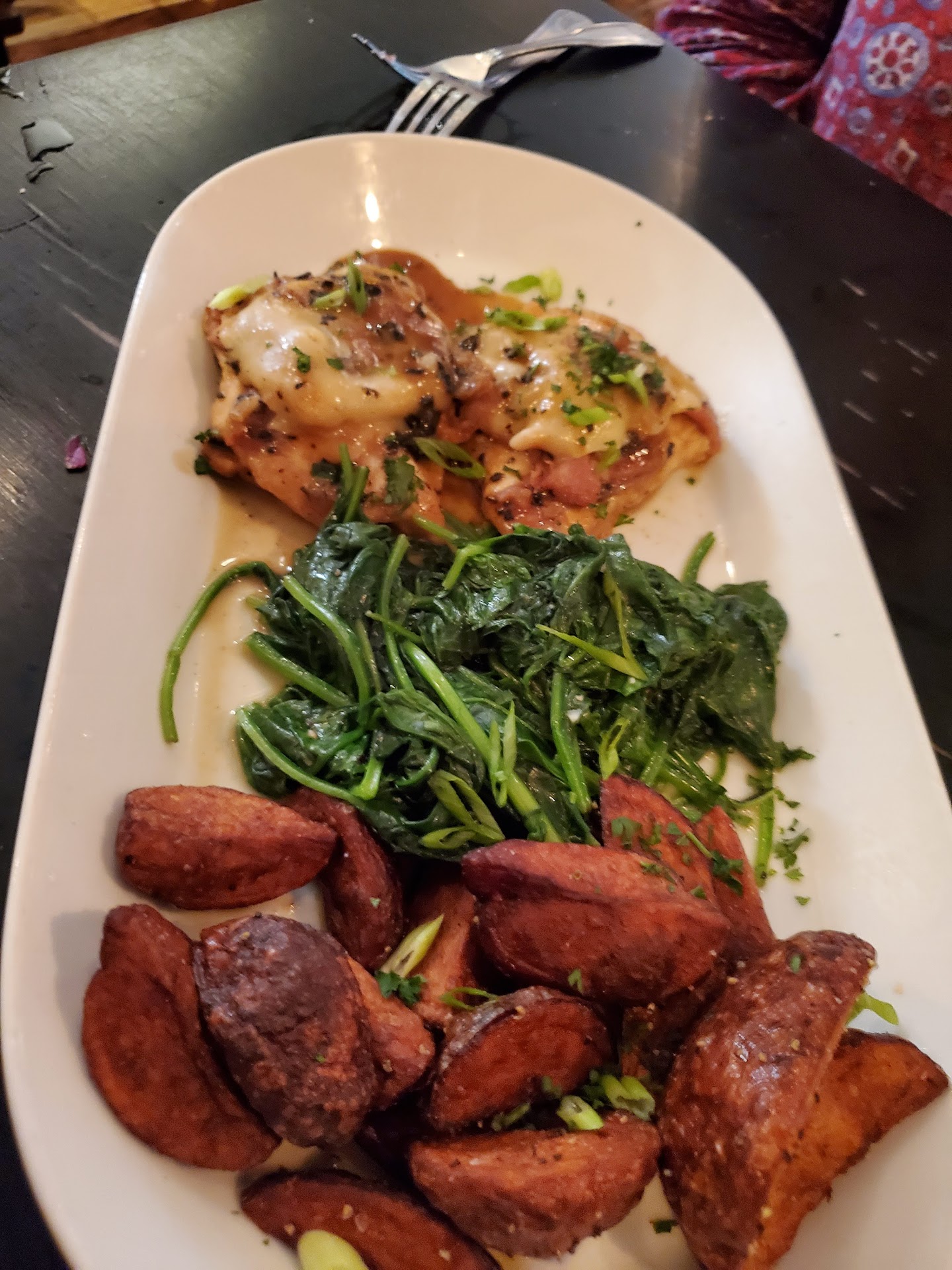 For dinner my lovely wife ordered the chicken saltimboca ($26) which included excellent sides of sautƩed spinach with garlic and oil and roasted potatoes.