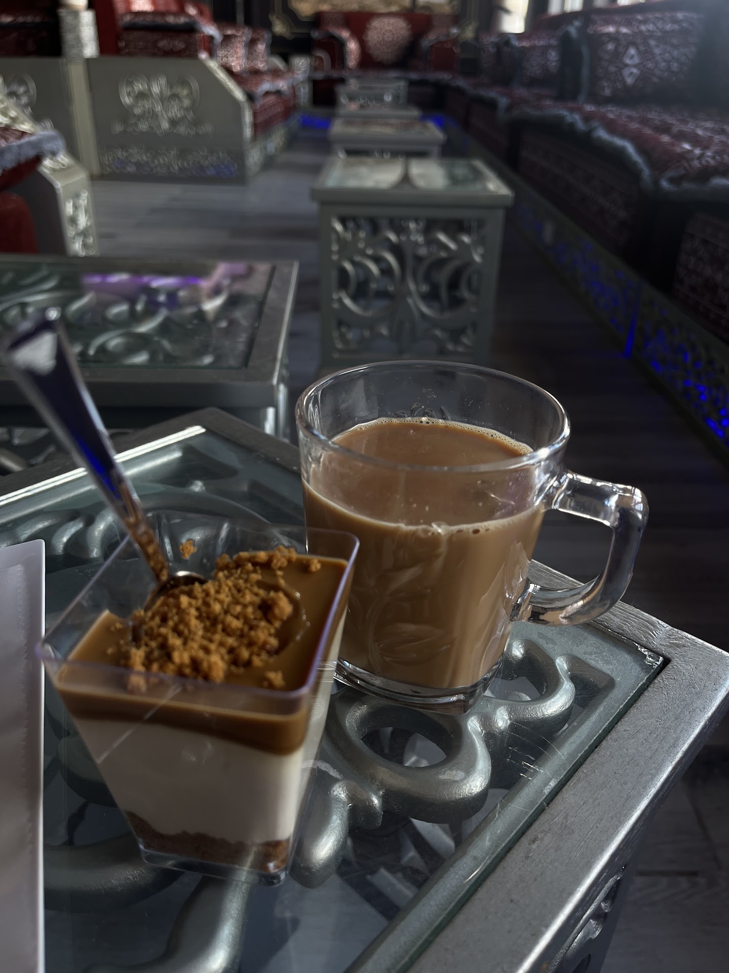 FOR MY LADIES: LISTEN UP I decided to check this place out after seeing a friend post it on their socials. NOTE: There is an entirely separate door for the cafe and a stair case that leads directly up to it (DO NOT ENTER THE RESTAURANT ENTRANCE). My friend and I had made the mistake of doing just that and we had the unpleasant experience of being cat called by the diners within it. One of the restaurant staff was kind enough to show us to the door. THEY ARE SEPARATE BUSINESSES. The place was empty, which is a little expected for a mid afternoon tea time. We were greeted and told to take a seat anywhere. There seems to be a side for women and a side for men (which is good for Muslims). The man provided us with menus and gave us some time to order. My friend ordered the Yemeni black tea and I ordered a karak chai and a pastry. While we were waiting on the drinks, we were served the pastry and complimentary tea. Later, when our drinks came out, the staff even offered us a pudding of some sort. The drinks were wonderful (on the sweet side for sure). The pastry was savory and not too sweet, the pudding was a new experience and it seemed to be made from some type of toffee (It was welcoming for my sweet tooth). The total may have been discounted but Iām not too sure. But it was super, super cheap. My friend and I spent a total of an hour and a half there and there was no sign of any other customers. After we paid, I asked the staff to lend me a box for the pastry that was left over. The staff gave me an entirely new pastry to go. The service was phenomenal. We will definitely be coming back. *For my Muslim ladies: I would avoid coming at night due to the presence of shisha and a more male dominated demographic. I would recommend potentially installing a barrier of some sort to separate the men and womenās side. I donāt know whether I would have been as comfortable with any male customers around. Overall, this is a gem of a place and Iām glad to see it open. They are open late nights, which will be welcomed...