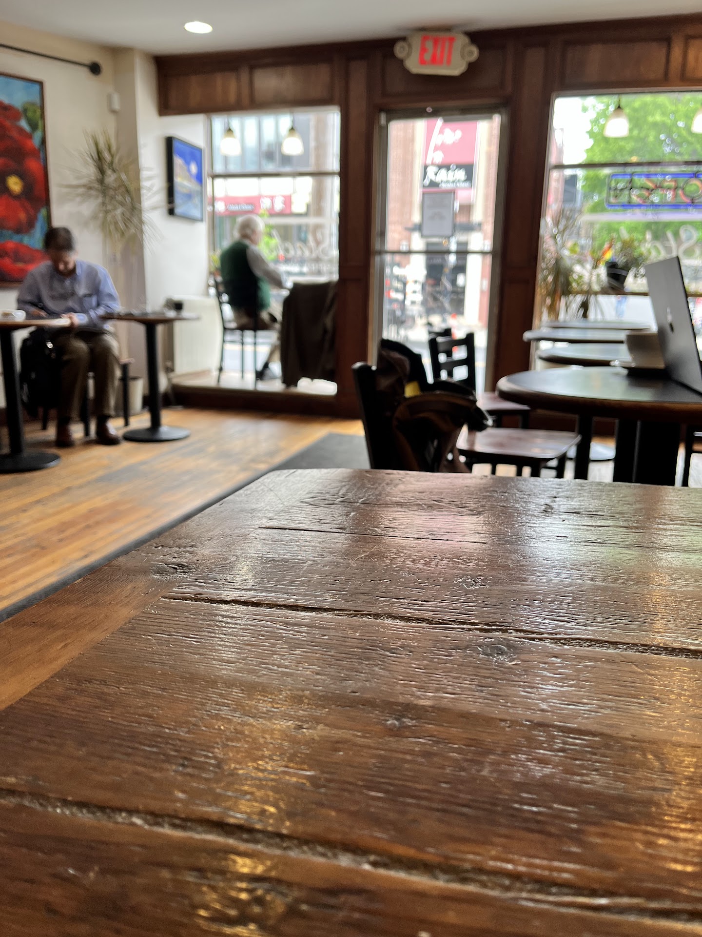 Read moreTruth! I enjoyed the 20 minute walk from the Renaissance, flowers, buildings, and ever deteriorating landscape til you get to this street which reminds me of Old Town Chicago 1968..kinda. This is a small place with ok coffee and Two young folks working behind the counter…friendly and very talkative…never the less the man in front of me had to repeat his order twice after I got in line. God knows how many times he’d said it before I got there because there was discussion and changing of position and…. I ordered a croissant. Bits just bread nothing croissant about it except perhaps it is wearing a croissant coat to hide the white bread beneath. Folks seem content studying their Apples - all except a very elderly man who sits at a counter table in the window alcove facing the street. He has a pen and paper, his head in his hand. Maybe he’s a poet. Must be hot over there. Reminds me of Hamburg. Poets swinging in the windows. The music is not too loud but unavoidable..Talking Heads Donna Summer hall and oats but never Rickie Lee. Where’s Chuck es in Love? Perhaps there are better places closer to town. Nothing much on the menu here . At all except a whiff of steamed not- Homemade Funk. But I’d rather have a nice soft boiled egg. Coffee is not bad though not much favorite bean and tastes slightly burnt. Oh- Donna...