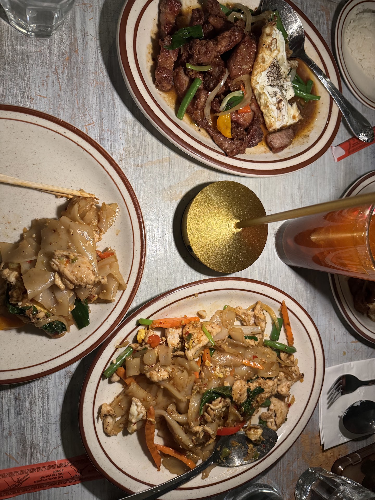 The choice of entrees was difficult given the extensive menu. I felt like noodles and though I’m not sure that udon noodles are Thai, I had the udon noodles with shrimp. On most of the dishes you can choose your protein, priced accordingly. One companion had one of the “wok” dishes, eggplant with chicken. The eggplant was violet in color and cooked perfectly. Our other companion had fried rice with tofu, that unfortunately came with egg given that he is vegan. Able to eat around it. Servers had a bit of trouble refilling soda and water but not a big deal.