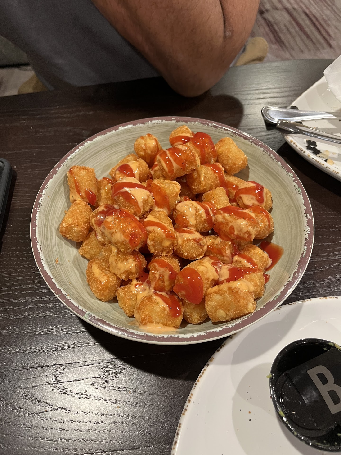 I would give this zero stars if we could. Worst “restaurant” experience ever. It’s really just a food counter. Every time we asked to order an item they said they were out of it entirely, or didn’t have many of the main components of the dish. No crispy chicken breasts, no burger patties, no Gorgonzola cheese, etc. After asking what they did have, we settled on Loaded Tot-Chos a Grilled Chicken Sandwich (that’s supposed to come with cheddar, lettuce, tomato, etc) with an arugula side salad, and some Bacon, Chicken & Cheese Quesadillas. We waited 20 minutes before the quesadillas came out. They were fine, but beware that guacamole = some previously frozen scooped avocados, no seasoning or additions. My husband waited another 20 minutes before my Grilled Chicken Sandwich came out to start eating, even though I told him to go ahead and eat. Then my sandwich was served as a Buffalo Chicken Sandwich (not what I ordered) made with a grilled chicken breast, Buffalo sauce, and lettuce, zero side salad and fries on the side. At this point, I just ate it. It was 9pm. We traveled all day, and we were hungry. As we were finishing our meals, another 20 min later, the “Loaded” Tot-Chos arrived. This was a bowl of tater tots drizzled in ketchup and Buffalo sauce. That’s it. Zero toppings, so the definition of loaded is debatable here. Not sure if she forgot the rest of the ingredients, or if they just didn’t have them, but we were done. Left them on the table and just gave up. Please skip this place and go anywhere else nearby instead. We also had to pay $44 and change for this, plus a good tip, all before anything was ever served. Definitely asking...