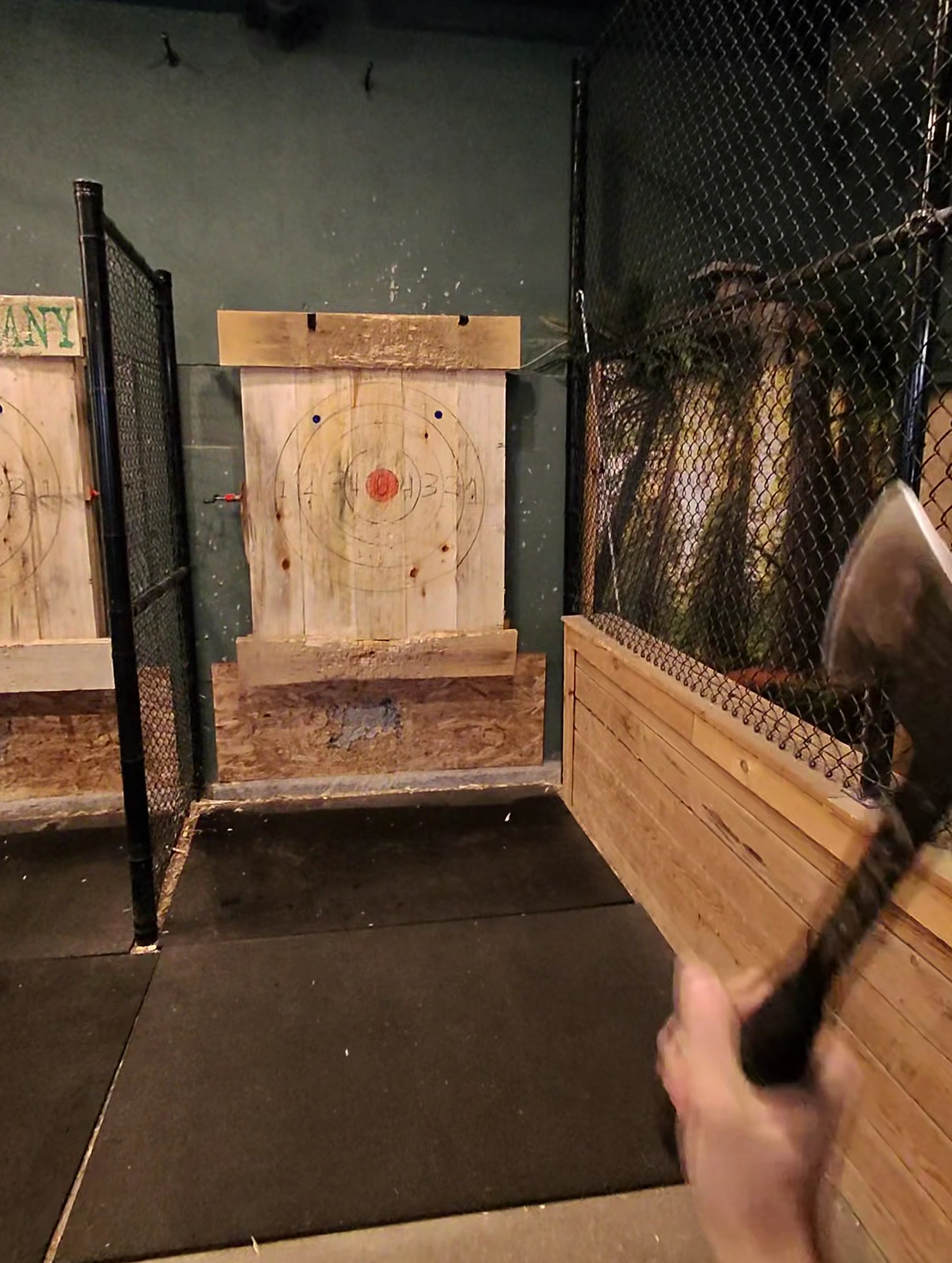I came here as a work event and Chris, the manager working our event knocked it out of the Park helping our group with the food trays we ordered and our individual drink orders. I tried a Berry the Hatchet and Chris was able to sub in Rum for the base drink and it was super tasty. I was then particularly delighted with my Motherpucker drinks made with the hard cider Nine Pin base and sorbet. Corn hole and hatchet throwing (please be advised to sign their waiver upon selecting axe throwing!) and I had such an amazing time with my coworkers and had that much better of a time because Chris took special care to work magic to make our event that much better. Well done! 10/10 would come back if in the area. 10/10 would recommend. Definitely recommend a swing on the swings! Please note. If you have gotten to the Knick apartments, you've walked too far. The Yard is on the corner with the amazing outdoor veranda and axes on the sign....