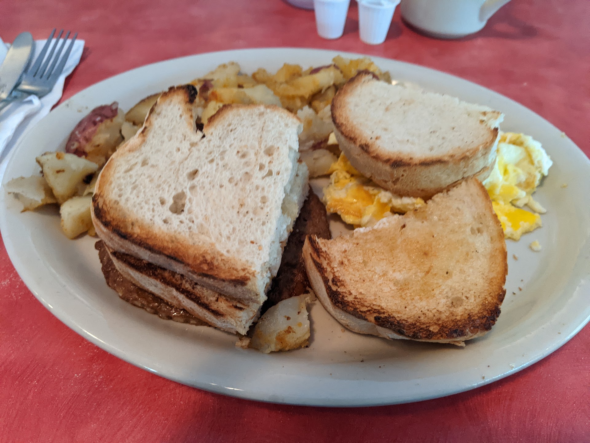 Had breakfast here with my Pop and Son on a Saturday morning in early June. Very busy. Had about a 20 minute wait outside. Wished they could've served us outside on their patio tables. Great vibe, good ambience both outside and in. Not sure why they have such nice outside seating but don't use it. Regardless, it was worth the wait I suppose. The food was fantastic. Bring your appetite, no jokes on their portion sizes. Quirky service though. I had ordered an orange juice and was brought a cup about a 1/4 full of juice. The gal that brought it said they were out and needed to run down cellar to bring up more. She stopped by the table several times asking if we needed refills but seem to miss the orange juice everytime. A testament to how busy they were was my guess. Another server happened along a bit later and rectified the situation. They did not charge me for that OJ by the way. It gave us something to jokingly chide about at our table other than ourselves. Everyone enjoyed their food. My Son had the Montecristo and loved it. To my surprise really. . .as he has never liked anything to do with eggs. Considering the whole sandwich is dipped in eggs I found that quite revealing as to how good it must've been. My Pop had the Western Omelette and was more than content with his. He found the orange juice situation very entertaining. So he got a good breakfast and a show. I had the Sausage Gravy & Biscuits with a couple of Sunnyside up eggs. HOLY SMOKES!! Did I mention the portions. I was very satisfied with my choice. It was delicious and I had leftovers for dinner that evening. It was perfect. I definitely recommend coming here if you are in the Auburn area around breakfast time. Don't be afraid to speak up if you need...