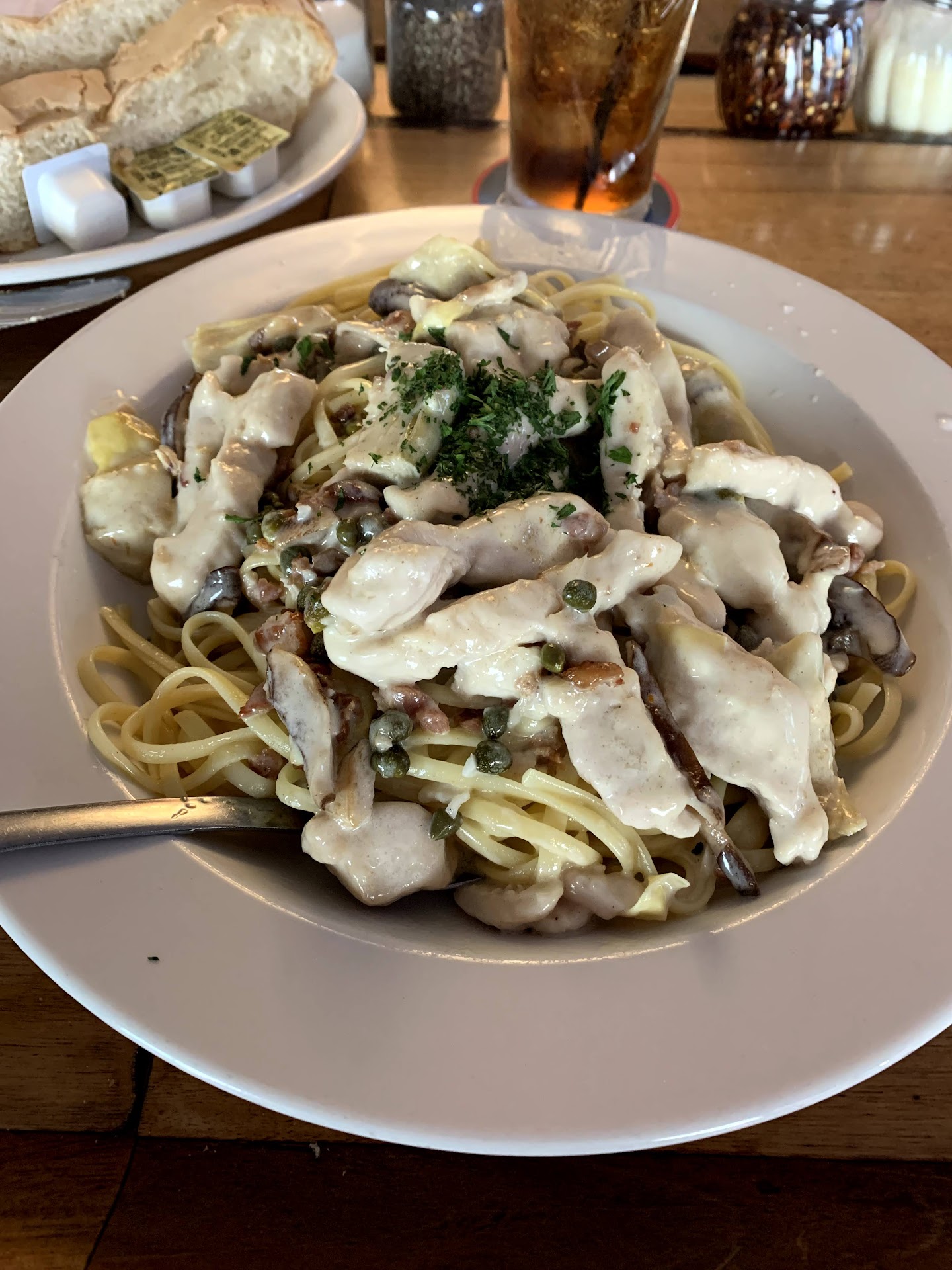 This was our first time here. We made reservations for 6 pm. We waited less than five minutes and were seated. They had a restaurant week special going so we ordered that. We started with crab stuffed mushrooms. They were yummy. We ordered the 14 oz ribeye with peppercorn sauce. One was cooked medium the other medium well. Was definitely a bit surprised to see them come out completely black and charred. Didn't mind though it was cooked internally how we wanted. The steaks themselves were SO salty , and I mean salty. I love salt however it was too over powering . The cheese cake was nice. They had a lot of people waiting most of the time we were there. Our food was brought out in a timely matter. Which was appreciated. It took us awhile to be able to get the bill and pay though. Overall I'm on the fence about this place. Not sure if I recommend it or not. The pastas I saw coming out to other dinners looked amazing. Thinking I may have to stop in some other time and give one of the pastas a try and update my...