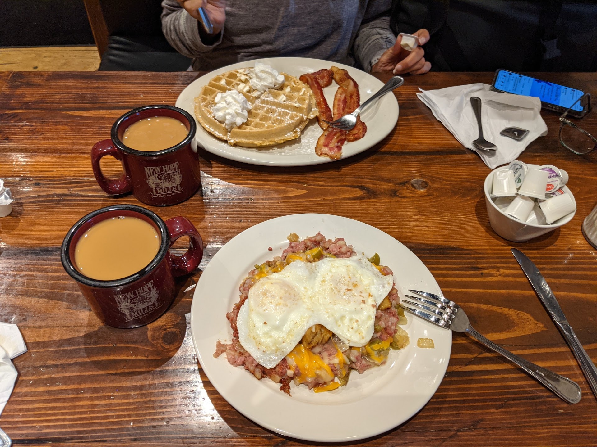 Read moreWe had high hopes for breakfast at a place that specializes in breakfast foods! Their pancake and waffle mix has been my favorite for years, so I was really looking forward to this visit. There were about 8 tables and we took the last seats, so it was busy given the size of the front dining room. Not sure if there is additional seating elsewhere. There were employees everywhere⌠there were at least 6 ladies huddled in the service pantry off to the side. Our waitress seemed frazzled as she flurried about, but Iâm not sure what the other employees were doing. There was a lot of aimless walking around. The food was alright, but definitely not great. My sweet potato waffle was really soft and kinda soggy (without syrup). My boyfriendâs corned beef hash was also mush⌠definitely not homemade. He didnât even finish it, which is unusual for him! Our toast showed up 3/4 of the way through the meal. It was an overall disappointing experience which...