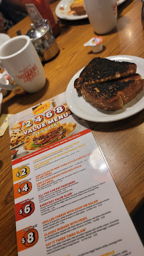 My friends and I went around 10pm and we were seated quickly. We were ordering our drinks (they were out of supplies to make some drinks) which took about 15 minutes… it seemed like there were only 2 servers and 2 chefs? So that might explain why it took a while but it’s alright. We ordered our food (which they also ran out of supplies for like the boneless wings and burger buns). My 2 friends ordered the mac n brisket skillet, then everyone else ordered some type of sandwich or burger. We waited an entire hour, we never heard them cook the brisket until like 40 minutes in… and when all of the food came out, only 1 brisket was presented. We were just then informed— let me mention, after a whole hour— that they only had enough mac and cheese for 1 skillet, so this lady server (which was incredibly understanding) offered a dish on the house to make up for all the inconveniences. He wanted T-bone steak, but they were out so he got the sirloin steak, and we waited another thirty minutes for it to come out. By this time, everyone was already done eating and he was still waiting. We never heard the chef(s) in the back sizzling something (it’s easy to hear what’s going on in the back), so when the sirloin was presented to my friend, he cut into it and it looked boiled or microwaved???? I’m not sure how to explain it, but the meat was practically jiggling and oozing of blood still (he ordered medium rare but it looked the rarest) and when he bit into it, he mentioned that he can still taste the blood. We ended up paying and leaving, and he ended up bringing it home to have his dad cook the sirloin for him. We arrived at 10pm and left Denny’s around 12:30am.