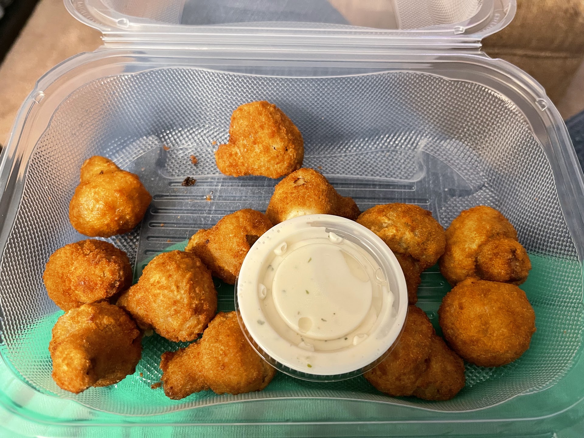 I got the breaded mushrooms and a burger. The mushrooms I ate one to try and threw them out. They are very clearly frozen. Itâs not hard to batter a mushroom on the fly. The mushrooms were completely mush inside. Leaking liquid which I can assume is water. Some were not cooked all the way and were still cold.