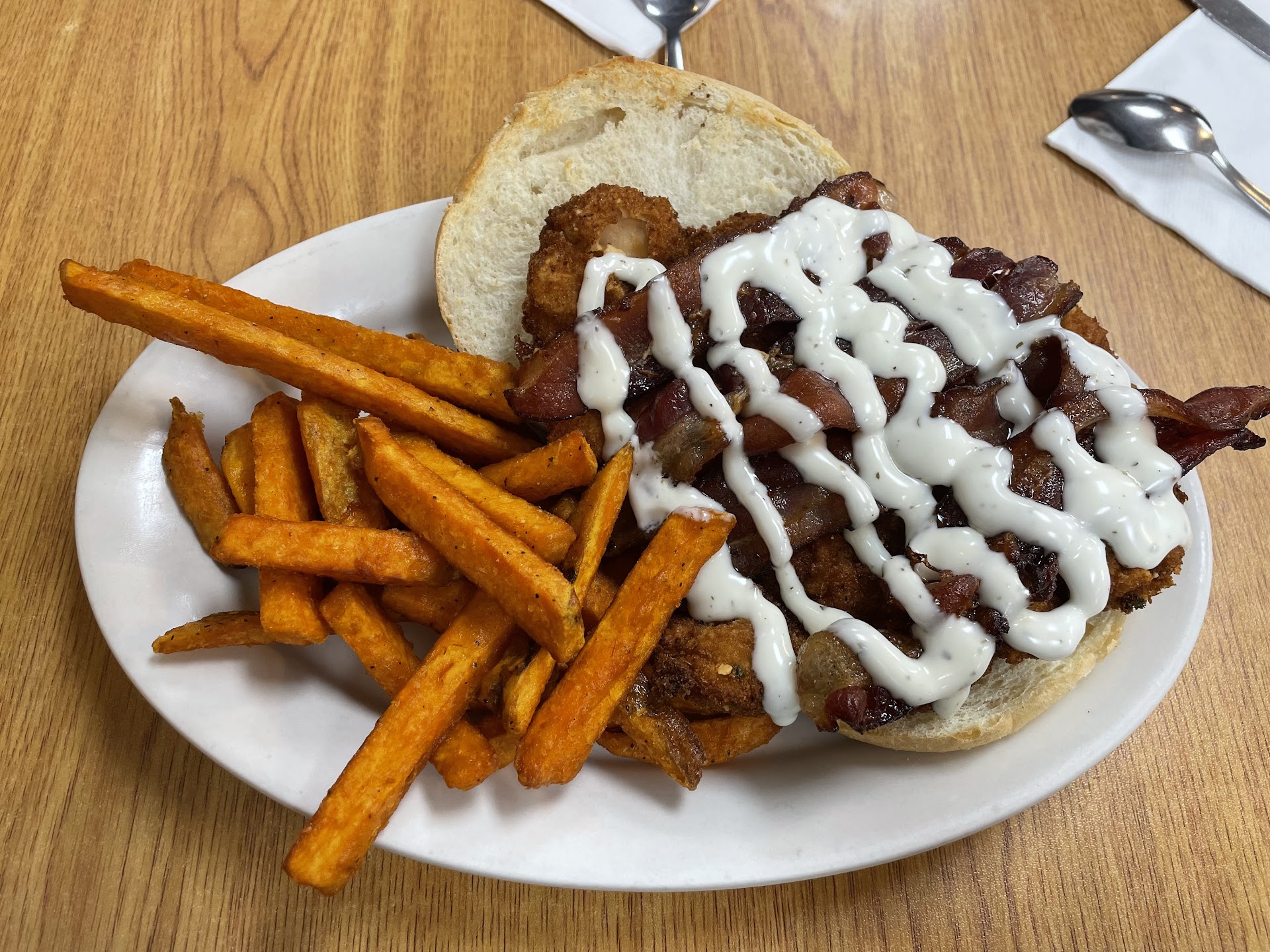 The service is always fast. Me and my boyfriend always have the same sweet lady and she always greets us with a smile. We always had gotten breakfast which is ALWAYS amazing never had a bad experience with this place breakfast. Today we decided to try the lunch and I had to give a review after trying it. I had the chicken bacon ranch with a side of sweet potato fries and omg it was delicious. The price for the amount of food we get is insane we get such big portions for such cheap price who can ask for better ? the place is always clean and cool. I never was a breakfast person till I had this place. I always crave the home fries. And the chocolate pancakes ? HUGE and YUMMY.