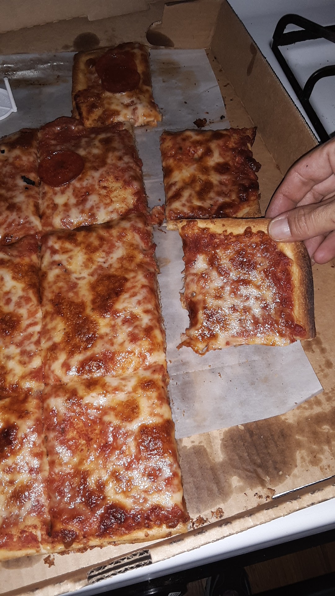 And everybody has their personal preference to the way they like their pizzas but me personally all their pieces are good The dough is great the sauce is good the cheese is good and melted.