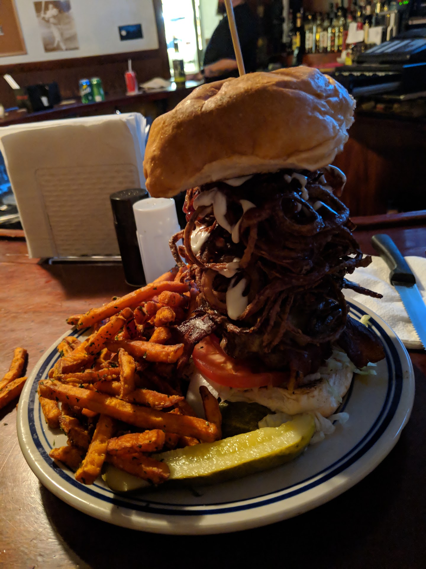 Read moreHave been meaning to come here for so long! Wondering why we waited! We went in the front entrance, into the bar. We asked if we could eat at the bar and were told we could eat anywhere we liked, but that the bar and restaurant tabs were separate. No problem. We ordered some drinks and grabbed some menus. So many burger/sandwich options, salads, pizzas, wings, appetizers. The server made sure to tell us promptly that it was cash only, good to know. We each got burgers - The Reggie and the Rustler, and instead of chips, did the $2 charge to get house cut fries with one, sweet potato fries with the other. Great presentation, the Rustler was overwhelmingly tall, with a skewer down the middle. The burgers were cooked just right and had take great flavors and seasonings. The fries were great, too, and a huge portion. Don't normally take burgers home for leftovers, but half the Rustler had to come home with us, along with some fries... too yummy to leave behind. Prices are reasonable, everyone working was friendly and helpful... just a neat little place that's apparently been around (with some name changes) since the 1940's! Would...