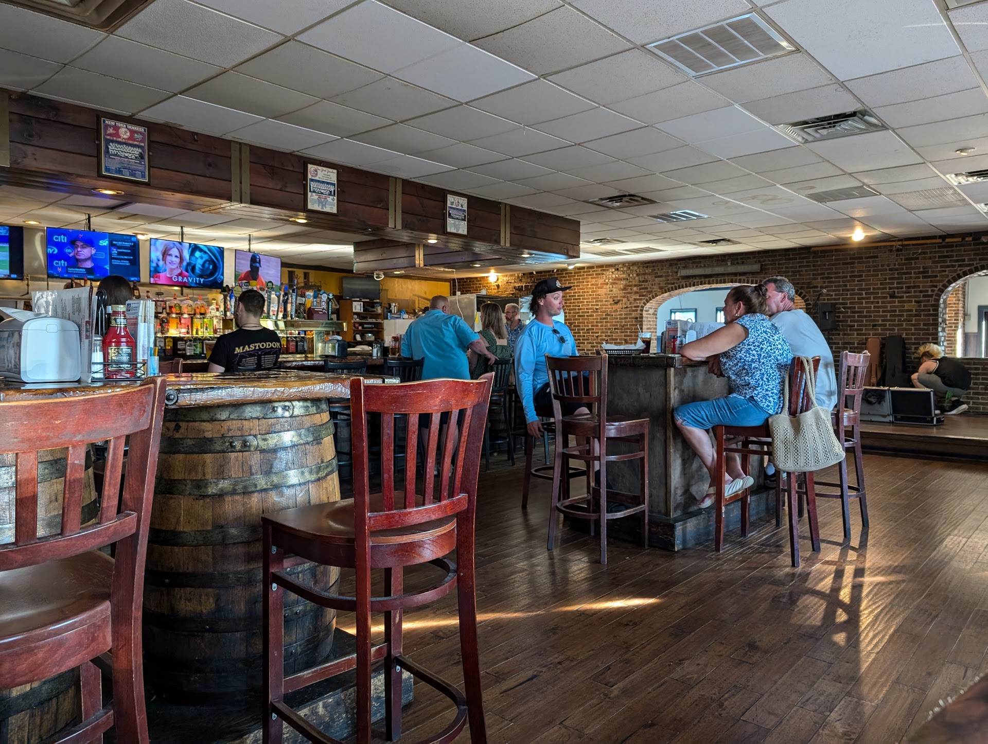 Not bad ambience looks newly put together so it doesn't have the old feeling of a cowboy or a country bar. The only thing that's really feels country in here is the music pumping out to the speakers. We got in sat down and find a seat easy enough, but nobody came up to us for a drink or a menu for about 15 minutes. When someone finally did come up to us it was a waitress so we ordered drinks. Even though the place looked p pretty slow. She asked if we wanted menus and we emphatically said yes. 15 minutes later to bartender is coming up to us asking us if we'd like food. That would be a si amigo. Food came pretty quick once we ordered it. Both of us actually had the same thing which was the half pound mushroom burger. It's a big burger with dea descent amount of mushrooms and some white cheese, so we'll just call it white cheddar. Fries are pretty good, not too crunchy, note to salty, actually there the best part of the meal. right. The bun was too big for the burger and needed to be grilled. Tasted like they just come out of a plastic wrap bag. Price who is normal. Pretty nonchalant attitude getting the check for getting paid though. I guess it's who you know around here for better service. Out of towner customers beware I guess. Pretty good food I If you don't mind the wait. Even when it's seems...