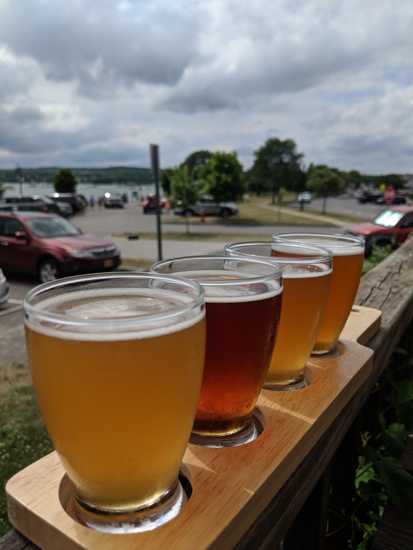 Stopped in here a couple weeks ago Tuesday (haven't had a chance to enter a review until now); place wasn't exceptionally busy given it was a weekday; menu was pretty straightforward pub food (beef on weck, flatbread pizza, etc.). After a brief wait while the barmaid took care of some customers we ordered 2 flatbread pizzas and 1 beef on weck, along with one of their in-house lagers. We were given a buzzer to let us know when our food order was ready for us to pickup, so we took our drinks out onto the deck to wait. There is a very nice view of the lake from the decks, however I noticed that the deck needed some attention as there were more than a few sections that should probably be replaced (the railing top next to our table was rotted and coming apart). Our food was actually pretty good: the flatbread pizzas were well cooked and tasty, and the beef on weck, while not the best I ever had, was still pretty darn good with a real kummelweck roll and well seasoned thinly sliced beef. And the accompanying homemade chips were very good and not greasy at all. Certainly worth the prices. The lager was very nice especially on a hot day. I'm hoping with continued support and success from customers, that they will be able to give the deck a makeover. But the food and at least the lager are...
