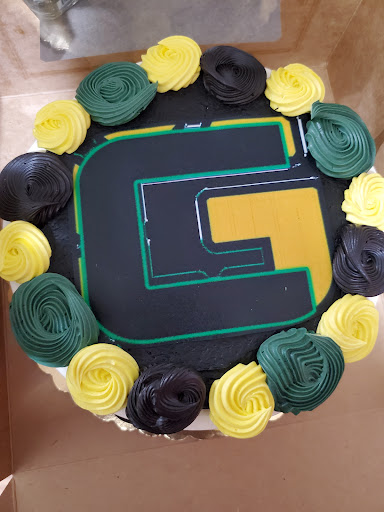 She called and said they didn't have gold for the gold drip. I asked for black, green & yellow drip. She said they can't do a different color drip even though she did it last year. By the look at the cake from my previous orders, it seemed like the real cake decorator couldn't take her rude nasty attitude and left. If you did please tell me where you went so I can order from you. Kayla is going to reply saying she gave me back some of my money-"to cover the cost of the vegan supplies." That cake wasn't worth the price. I've seen better at Walmart. She only got 1 star because my husband liked the logo.