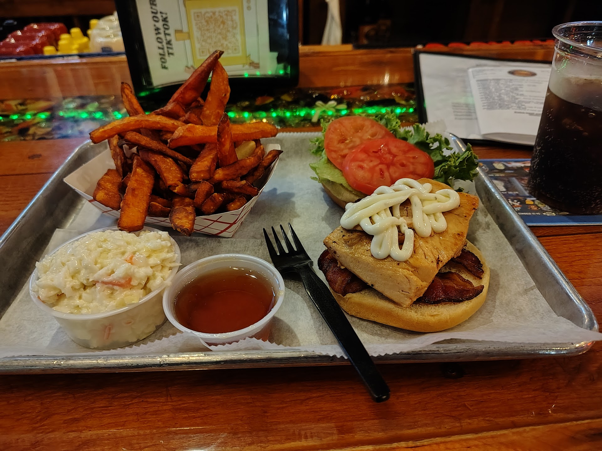 Read moreA memorable experience… just not for the right reasons. I’ll start by saying the food was really good jalapeños cheddar burger and chicken salad with sweet and spicy chili sauce. That being said, the service was nonexistent. After we sat ourselves a sign on the table pointed us to the cash register to order. Ok we get up there and nobody paid any attention until we commented on the girl sitting at the bar taking selfies… then she got up and got behind the bar apparently she was supposed to be working. There was barely any interaction at all. Both people behind the bar were too busy on their phones. Placed our order and as we are checking out (before we got our food or any service at all) we were asked for a tip! For what? As a rule, we are both very generous tippers, but come on. We got our own food, soda, utensils (which were plastic) and the food came in paper containers, which we cleaned up ourselves. We could have stayed home and served dinner and cleaned up for a lot less money. For us the point to going out is to NOT have to do the work. We should have been tipped. We did however, try to tip the cook because the food was good and honesty he’s the only one that did anything, but we were told they share tips and he put it in the container by the register. Even as we were leaving they were too busy on their phones to acknowledge that we were leaving, but at that point we didn’t really expect anything else. So if you don’t mind no service then by all means dine here, like I said the...