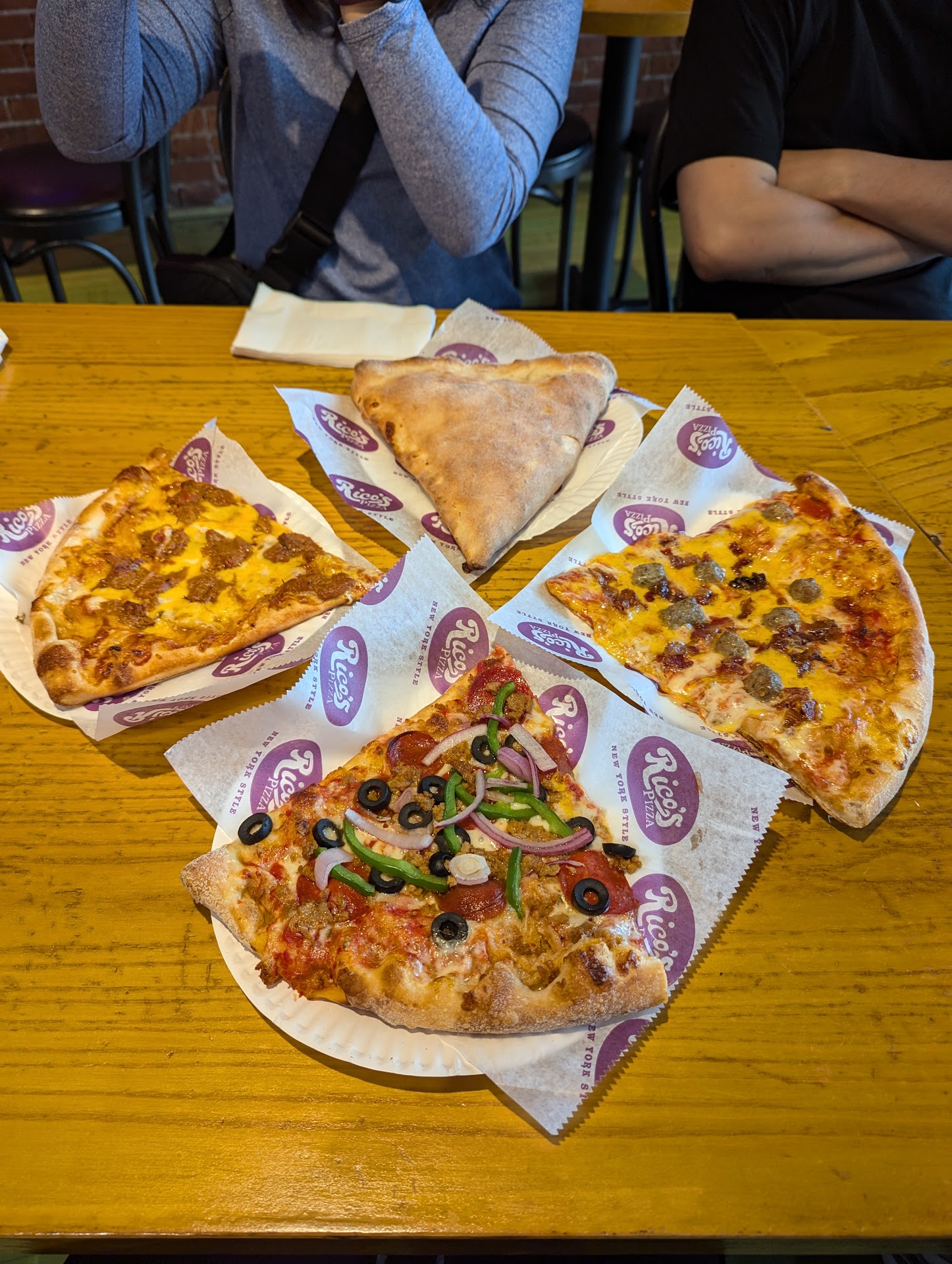 Since this place isn't a "sit and be served" type joint, tips aren't really needed but with the service we received, we felt they really did deserve one! When our slices were ready, the staff came to bring out our slices which we did not expect and when we asked for them to be cut, they came to our table with a cutter versus asking us to bring back the slicing.