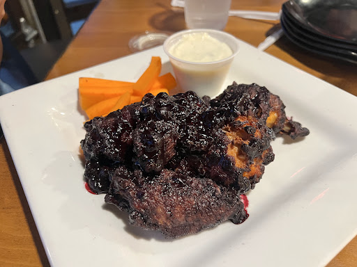 Now the wings… oh Lordy. They looked burnt but were lukewarm at most and soggy. The BBQ blue ball sauce was only blueberry jam basically. Nothing BBQ about it. Was honestly gross. In no world should that ever be combined with wings. Stained our fingers blue, because it was just blueberries. The wings themselves were nasty, like very gristly, fatty, and mushy after biting into them. We only ordered 5 wings to share and we only ate 3 between us. They were either made immediately and sat forever, or old and microwaved, whatever it was, just nasty. Hideous. The waitress asked how everything was, we replied not that great. She just turned and walked off. ❤️
