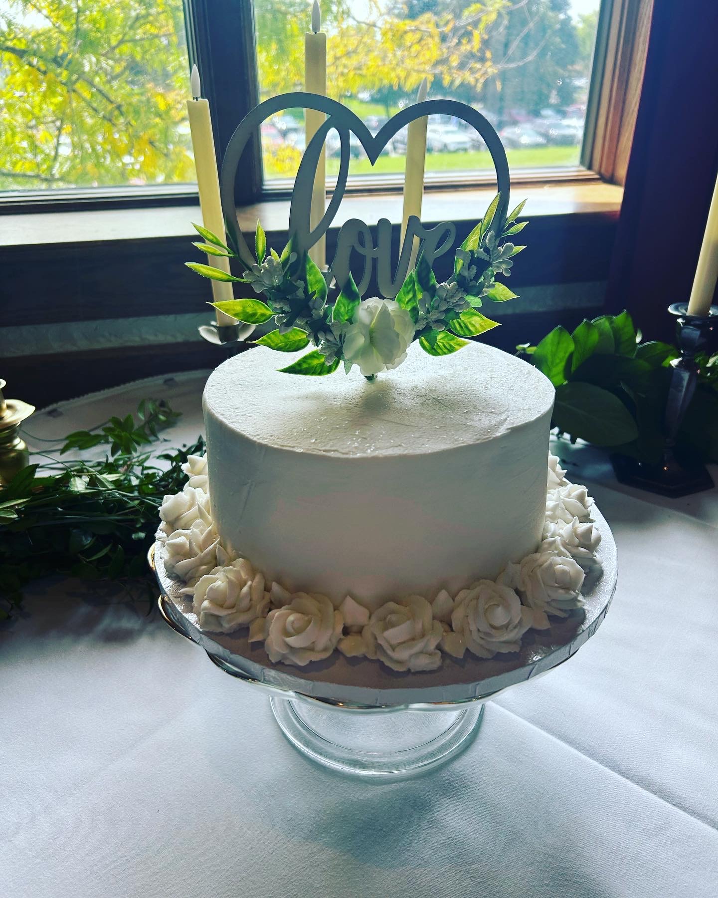 We ordered a small, two teir stacked cutting cake. It was a Swiss dot pattern, precise but simple. I did not get to see the cake until just before the dinner and I was so disappointed that I almost cried. Not only was the pattern wrong, despite having sent pictures of the exact design, but the whole cake LEANED. It leaned A LOT. When we did the cutting there was nearly a solid inch of frosting on the outside. It took two cuts to get to any cake. After the wedding, my florist told me that she had to put flowers on the cake to hide how poorly done it was and that she almost cried for me too. When we finally got a chance to try the cake, there was fondant on it which we had specifically told them that we didn't want. At least it tasted fine, I guess.