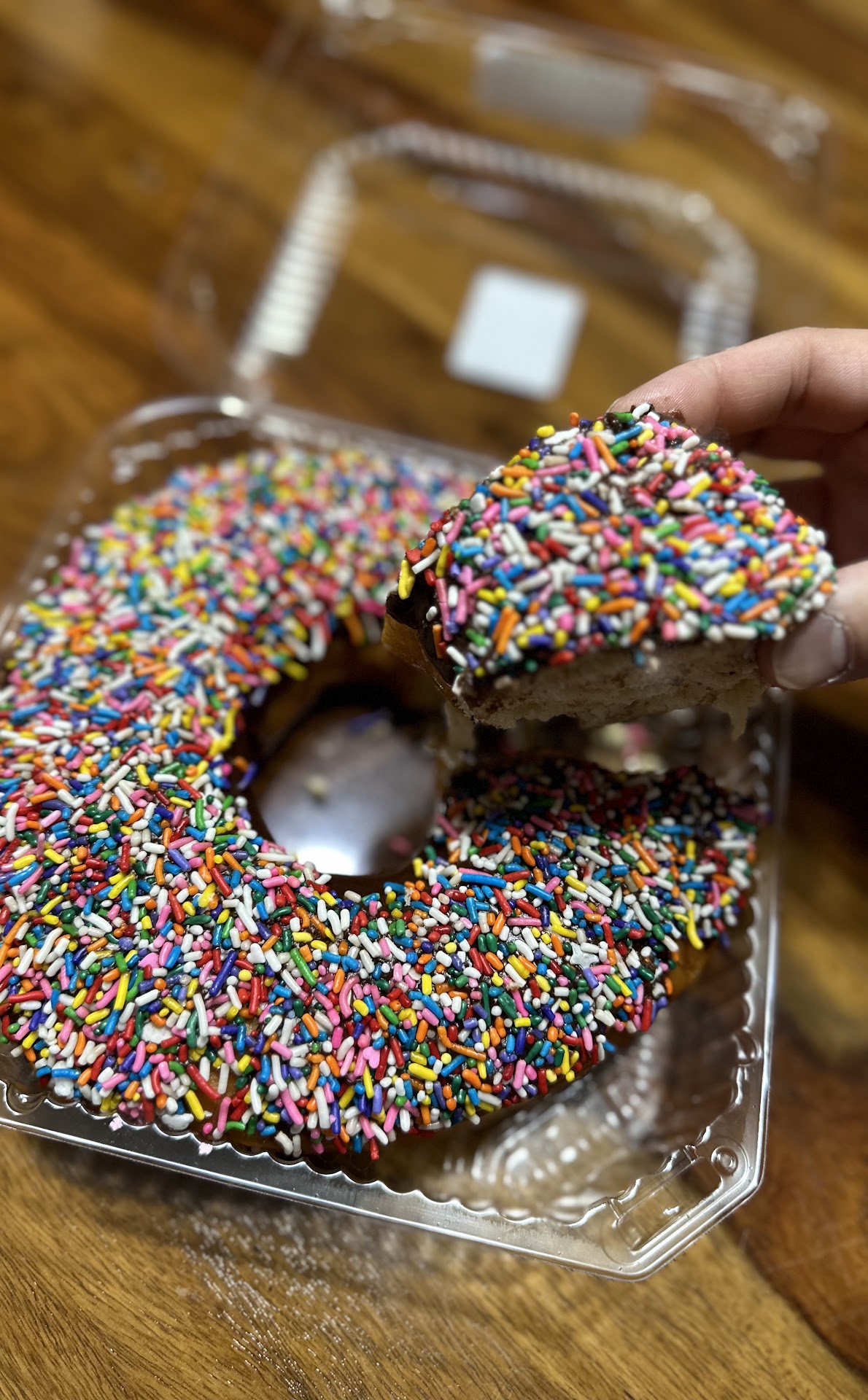 They have a giant donut, the size of your face or larger. Usually it’s gonna be a little harder than your regular donut for something this size. Also usually, it will tastyeats more cake like.