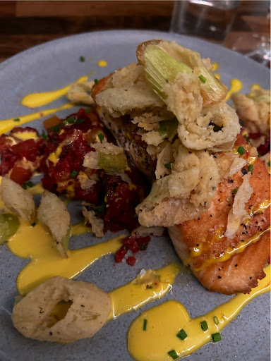 We had the poutine to split and they brought a few slices of focaccia with oil. The focaccia was good and we would have gladly had more if it was offered! The poutine had a brown gravy and pulled pork; my dining partners loved it, I thought it wasnât well seasoned, and definitely under-salted. For the entrees, we had the gnocchi bolognese (the gnocchis were huge! Bolognese was good but not as good as the sauce they used the last time we were here), the lamb chop, and the salmon (with a beet risotto that was interesting, but didnât eat like a creamy risotto).