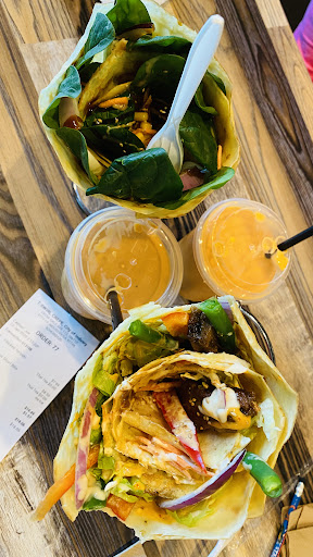 Chicken Teriyaki crepe - raw spinach, raw onion, corn, sliced boiled eggs, and chicken. The spinach is crunchy but tastes fresh out of bulk volume container and tastes unwashed. Corn tastes fresh out of the can. The raw onion is really strong and crunchy. The overall combination of flavor is ‘okay’. Kids didn’t complain too much and ate it. Of course, removed the onion.