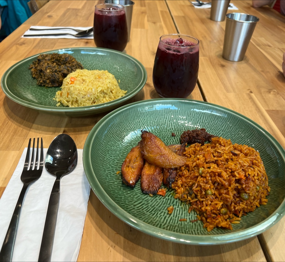 We got the jollof rice, egusi (a spinach curry dish), sobolo (delicious drink with deeply layered spices), and a side of plantains.