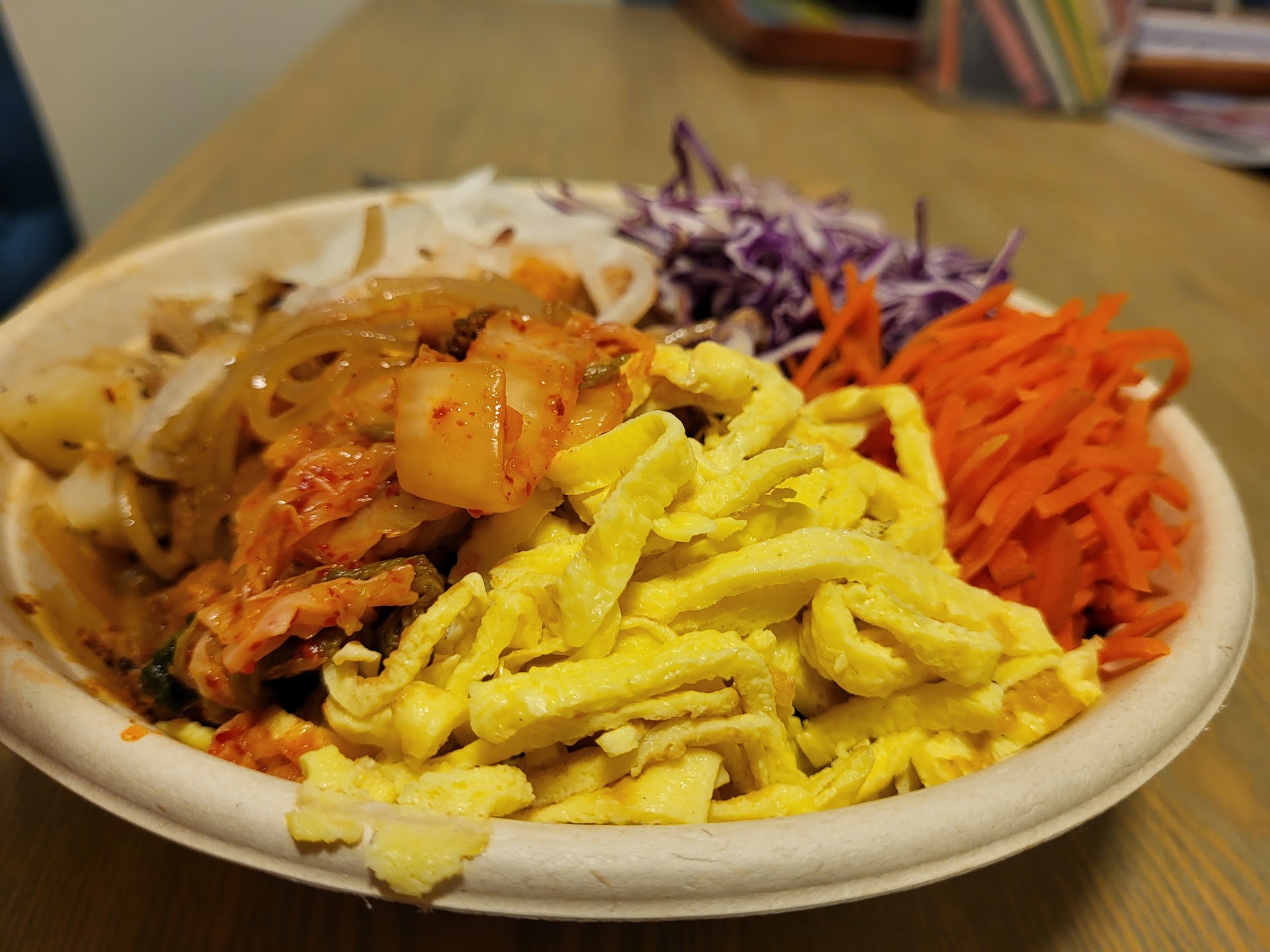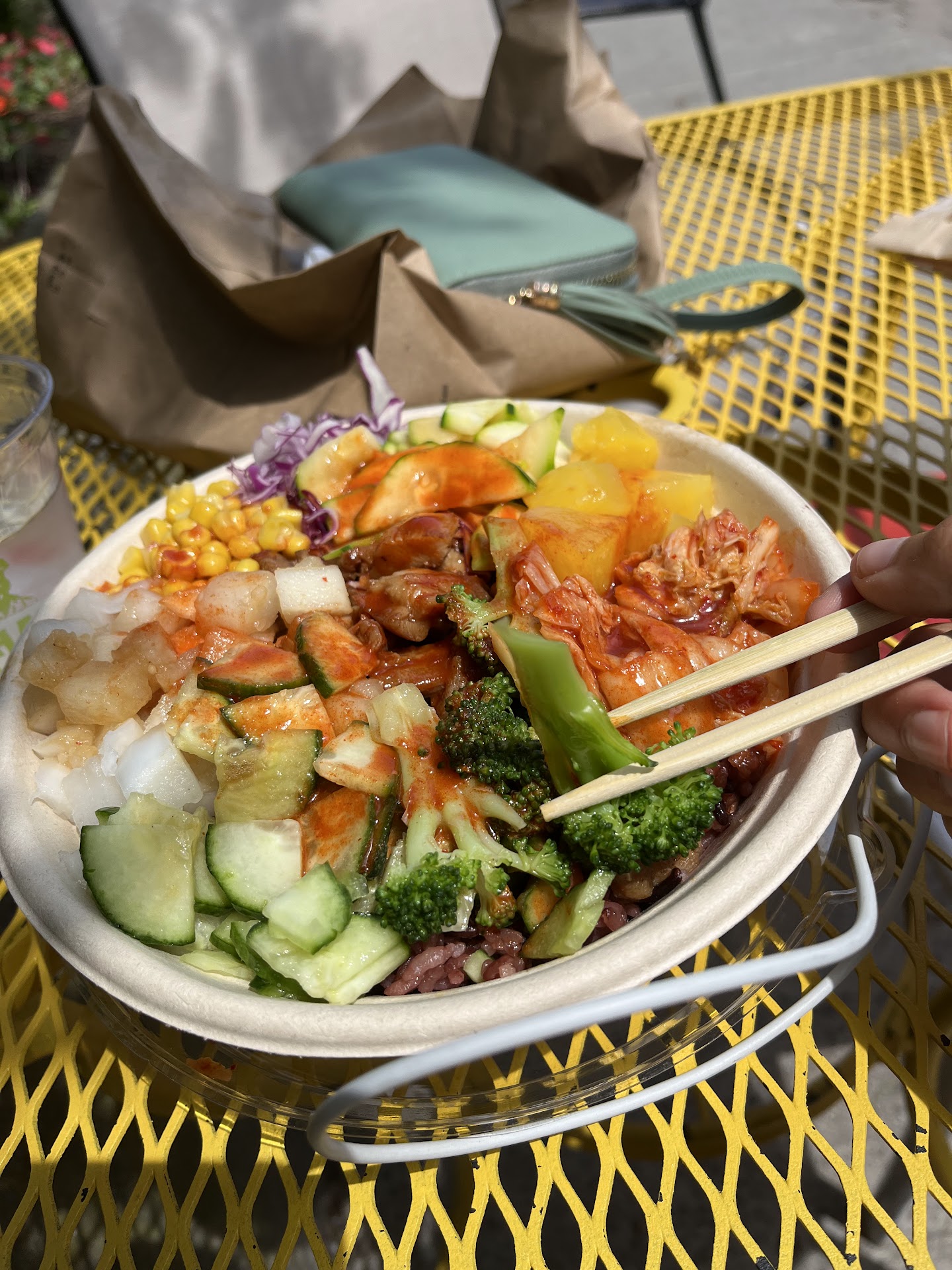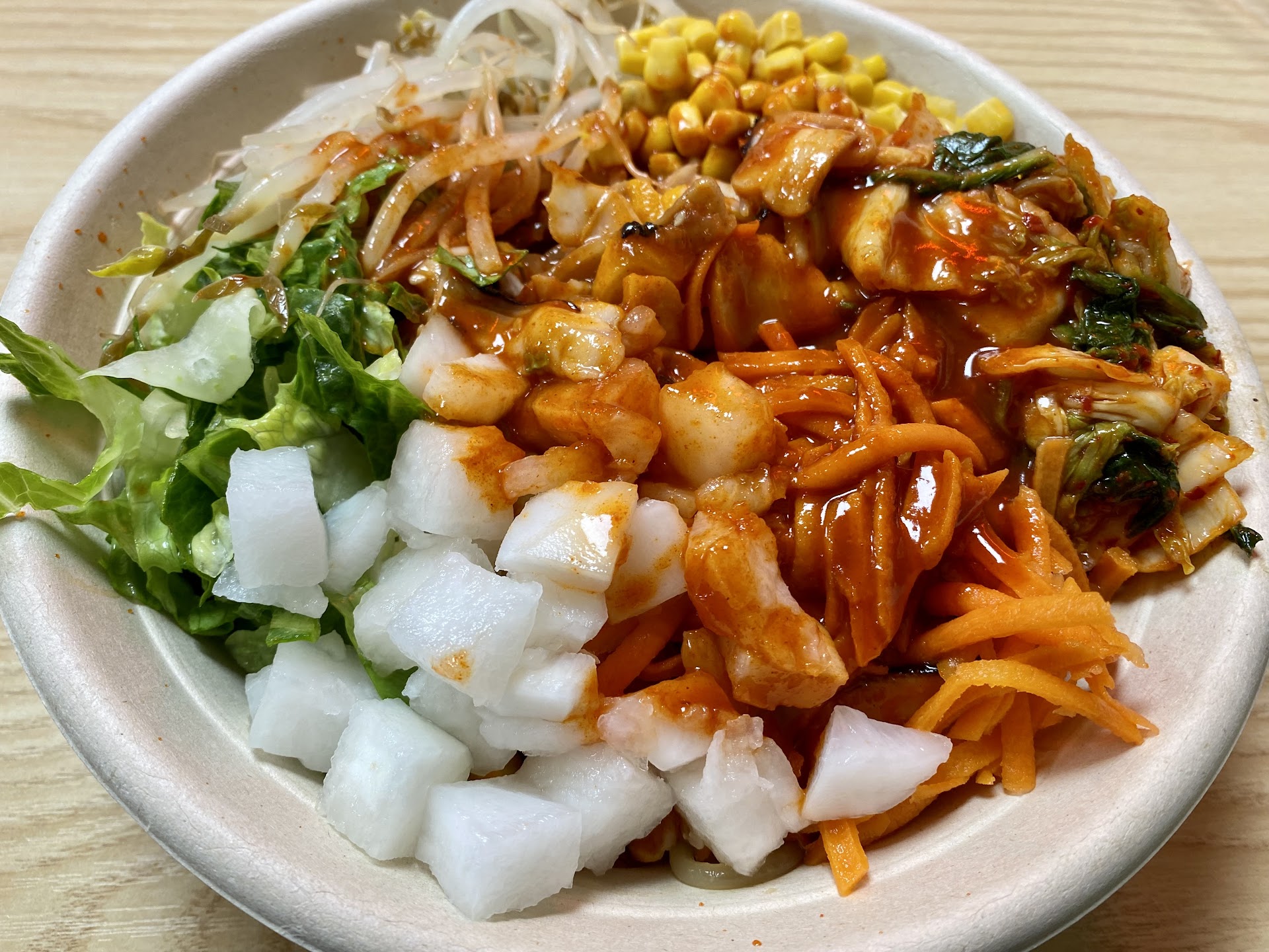 You can get a preset one or build your own, which I opted to do. I got purple rice and japchae as my bases, half bulgogi and half chicken, a bunch of veg toppings including daikon, kimchi, broccoli, etc, and gochujang sauce.