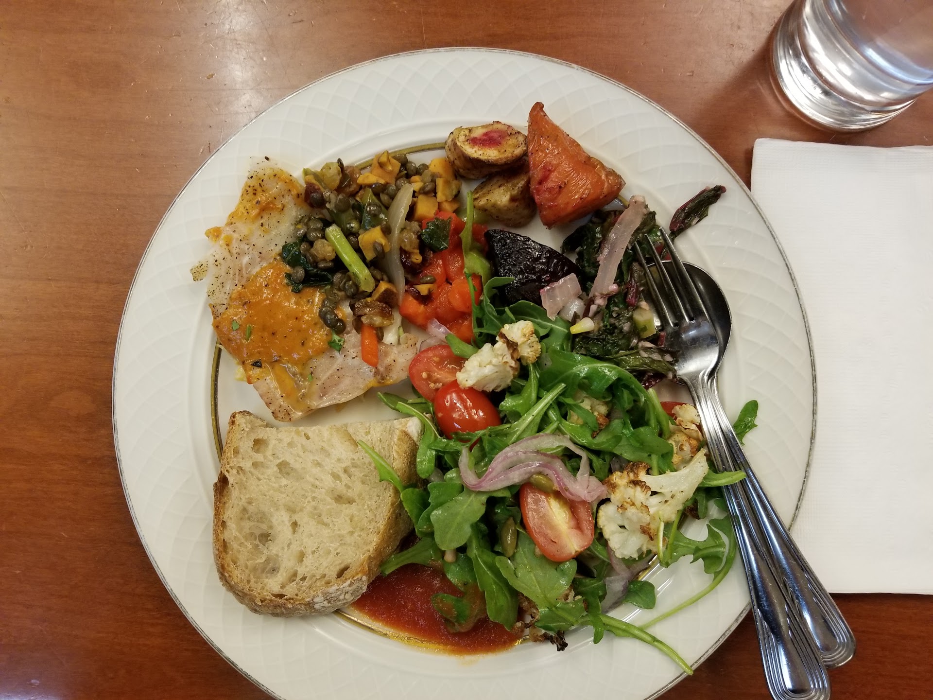 I like this dining hall! The hall is beautifully decorated with lots of colorful flags. So, it gives a really pleasant first impression. This is my first time here and I found the quality of both and desserts really impressive. The choice is limited, but they are tasty and pretty healthy. The arugula salad with pickled red onions and cheery tomatoes was sooo good in its own that I didn't even need salad dressing. Sourdough bread was a farmer-market-level high quality one. The whipping cream feels like it's made of real milk and the chocolate cake didn't feel too sugary. They seem to be attentive at providing vegan food (and desserts). But I didn't see much variety eg. no Kosher/Halal/Asian/Middle Eastern food. (But so far I have only been there once so I don't know how the selection will be in other days!)