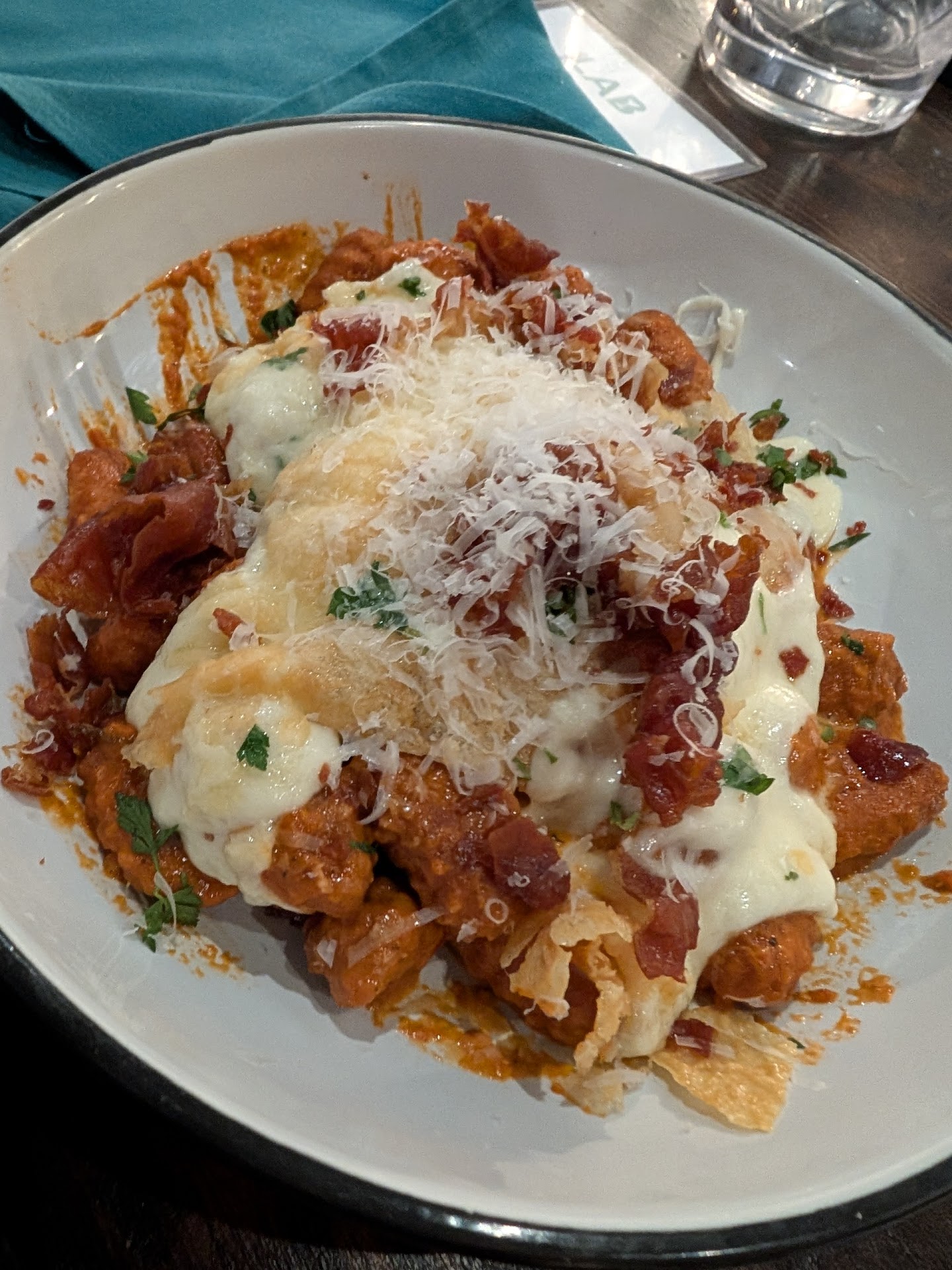 I went with company on a pleasant weathered evening a week ago, with the music loud and the half-walk garage door rolled up. I thought to myself, hungry as I am, we could get four starters and an appetizer. Firstly came the eggplant, which our server kindly warned us was hot to the touch so to be wary with the skewers! They were ice cold, and had to be sent back (where instead of being fully redone for their lack of being warmed at all, they were quickly reheated and re-served, lacking all the salt and flavor you would hope for from a 20 dollar appetizer. Then came the kimchi pakoras, which seemed to have their own salt content, and then the missing salt of the eggplant too. Halfway through the starters, we now were served the blackened fish tostados, which looked really similar to the pakoras! Oh wait, they gave us a second helping of the pakoras, which we were then able to quickly call to their attention for them to take away (and no doubt re-serve to someone else who ordered it). Finally we did get the third appetizer we ordered, which was the best of all the served food- at this point, it's only competition had been the water. When we finally came to the last appetizer, the sliders, these were just okay but again, exceptionally salty (and extremely plain). The main, the gnocchi, was also plain okay. Maybe a 4/10. Careful though! The softened garlic bulbs make up as much of the plate as the gnocchi, with the hard ends on them so woody and inedible that they'd be better suited for self defense than dinner.