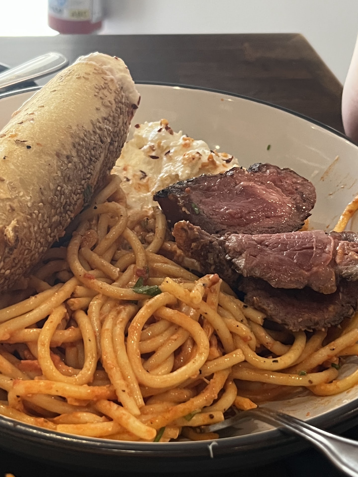 Read moreI stopped in for dinner while traveling on a work trip and, having been to several other restaurants on the same street, I expected a similar experience given the strong reviews. Unfortunately, this visit was a letdown. The bartender was very friendly but clearly overworked, and the overall cleanliness left something to be desired — the bar area was messy with dirty glasses piled up, the countertop was sticky even after being wiped down, and the floors were greasy and slippery. We started with the Field Greens salad, which wasn’t very fresh and came with a dressing that was overly sweet. Next, we tried the whipped ricotta, which was fine but unimpressive, served with an excessive amount of balsamic and what seemed like store-bought crackers. I ordered the chicken parmesan, which sounded great but was overcooked and chewy, with bland breading and an oddly sweet sauce. The pesto pasta that came with it was the highlight of the meal. My friend ordered the New York strip, but it was so heavily seasoned — mostly with an overpowering black pepper spice — that he couldn’t finish it. Overall, nothing we ordered was particularly enjoyable, even though the food looked great coming out of the kitchen. Maybe we caught them on an off night, but between the cleanliness issues, the unbalanced flavors, and the overall inconsistency, this experience didn’t live up to the...