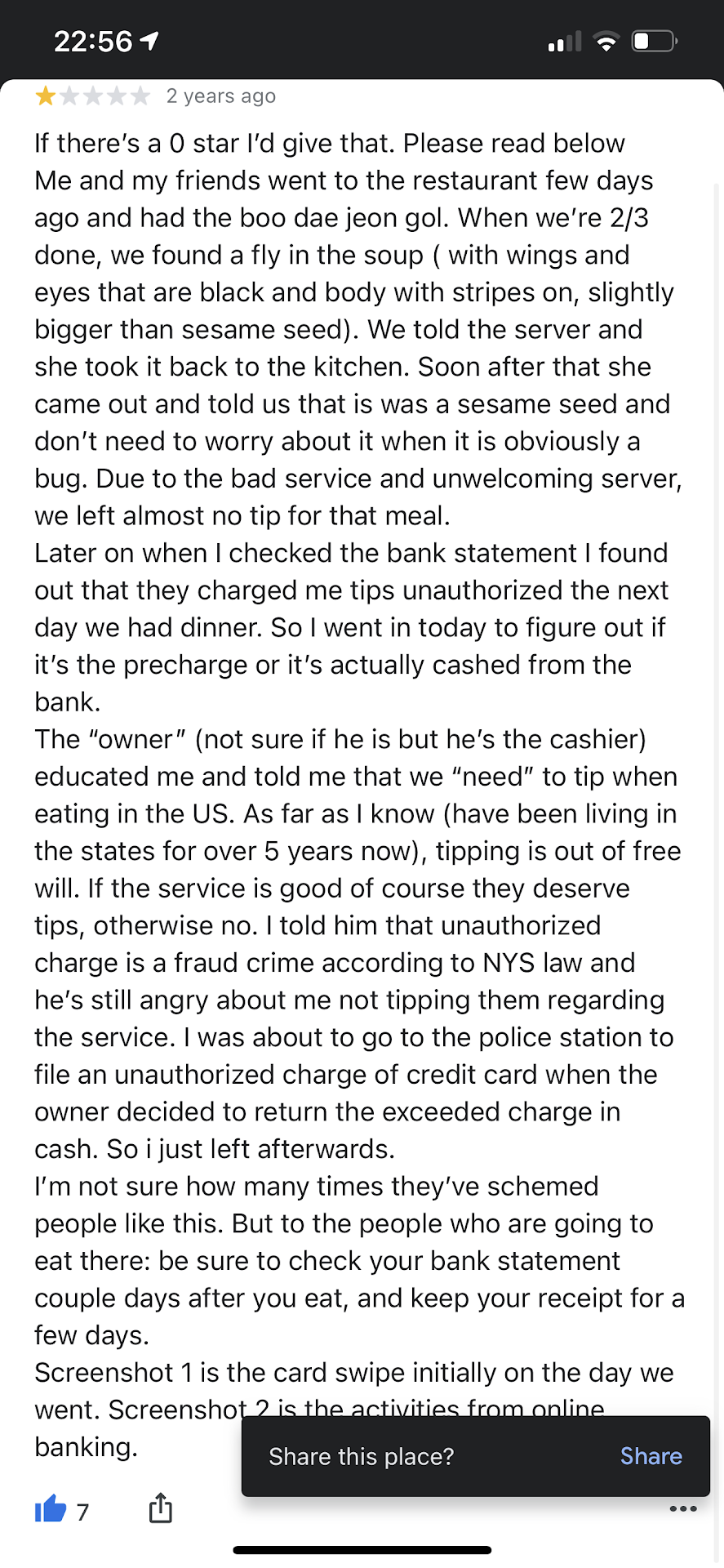 If there’s a 0 star I’d give that. Please read below Me and my friends went to the restaurant few days ago and had the boo dae jeon gol. When we’re 2/3 done, we found a fly in the soup ( with wings and eyes that are black and body with stripes on, slightly bigger than sesame seed). We told the server and she took it back to the kitchen. Soon after that she came out and told us that is was a sesame seed and don’t need to worry about it when it is obviously a bug. Due to the bad service and unwelcoming server, we left almost no tip for that meal. Later on when I checked the bank statement I found out that they charged me tips unauthorized the next day we had dinner. So I went in today to figure out if it’s the precharge or it’s actually cashed from the bank. The “owner” (not sure if he is but he’s the cashier) educated me and told me that we “need” to tip when eating in the US. As far as I know (have been living in the states for over 5 years now), tipping is out of free will. If the service is good of course they deserve tips, otherwise no. I told him that unauthorized charge is a fraud crime according to NYS law and he’s still angry about me not tipping them regarding the service. I was about to go to the police station to file an unauthorized charge of credit card when the owner decided to return the exceeded charge in cash. So i just left afterwards. I’m not sure how many times they’ve schemed people like this. But to the people who are going to eat there: be sure to check your bank statement couple days after you eat, and keep your receipt for a few days. Screenshot 1 is the card swipe initially on the day we went. Screenshot 2 is the activities from...