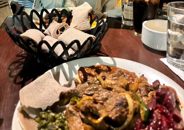 We ordered food; he got lamb and I got steak strips with veggies. As we got our plates with injera, we asked for a fork and the waiter told us, in passing, to use injera to pick up the food. While it is nice to experience cultural differences but this was not an issue at another Ethiopian restaurant or Asian restaurants, and we thought that was odd. He didn't approach our table to ask how he could help or explain anything. Usually, restaurants will ask if you've ever visited before so they can explain things such as this.