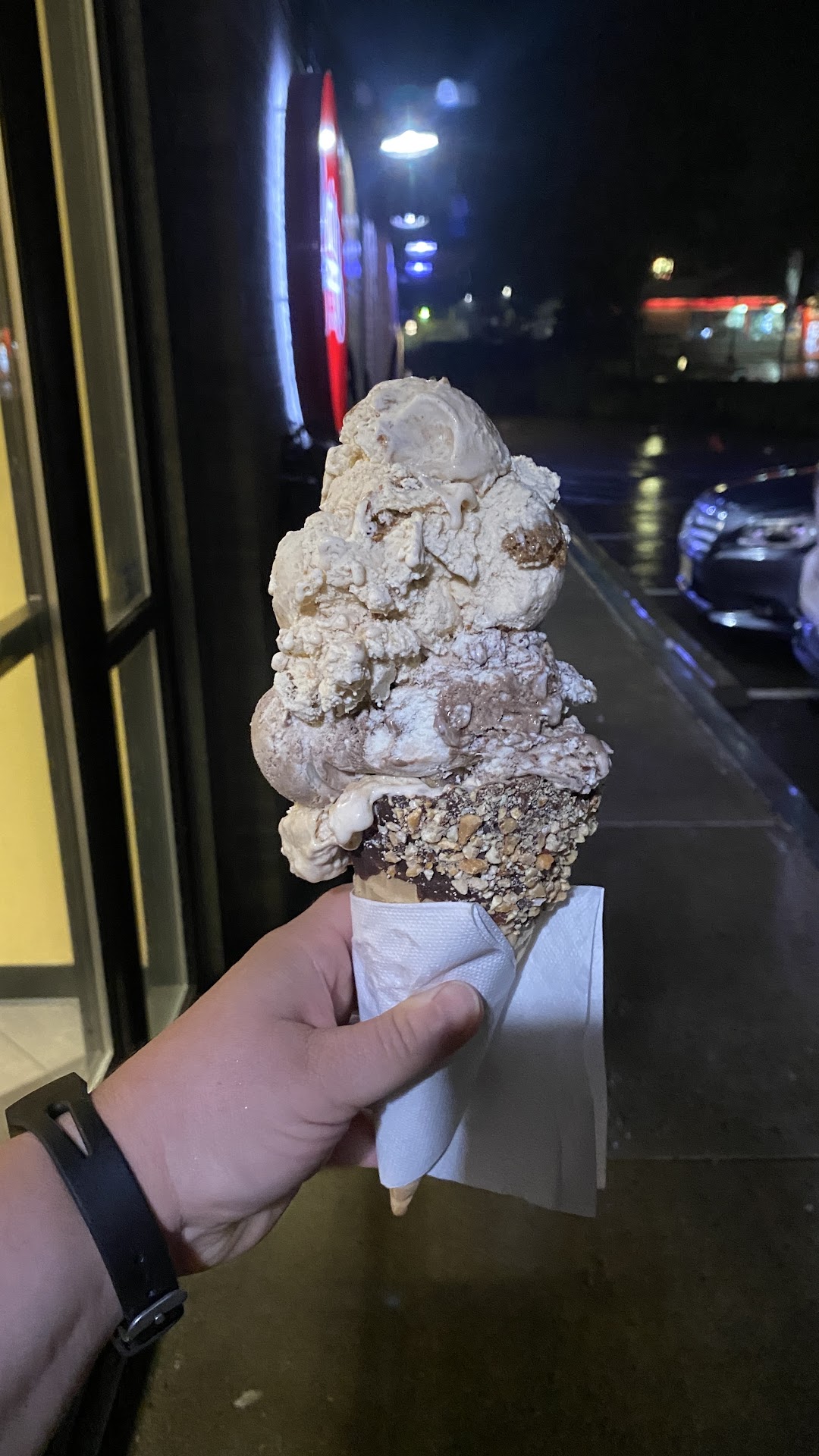 I waited for my order to come up to the window and was appalled at how much ice cream was on the cone! As he handed it to me I showed him what one scoop of ice cream is, he explained that these are their portions. No wonder it was like $8, one dollar was the add on of the waffle cone I didn’t want. Such a waste of money! It was so big it wasn’t even enjoyable to try and eat. I just wanted to taste those three different flavors, not buy a half gallon of ice cream. I’m disappointed to say the least and don’t think I’ll ever go back.