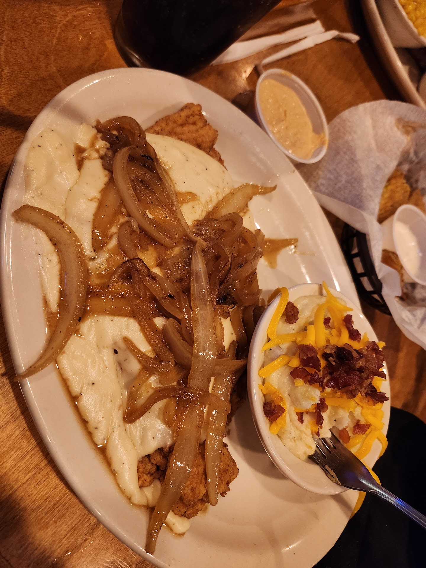 The food: The bread and butter (a cinnamon concoction) was totally delicious. It was followed by a bag of peanuts which our daughter loved. The appetizers came quickly. We got the sampler. Never had fried pickles before--- they were pretty good. I won't ordered them again, but I'm glad I had a taste. My wife was delighted by her frozen mango margarita and gave it 2 thumbs up. The chili was freshly made and I highly recommend it. My wife's shrimp and mashed potatoes were great and so was her meat--- medium done. TBH, my steak was a little dry, but the ribs were good.