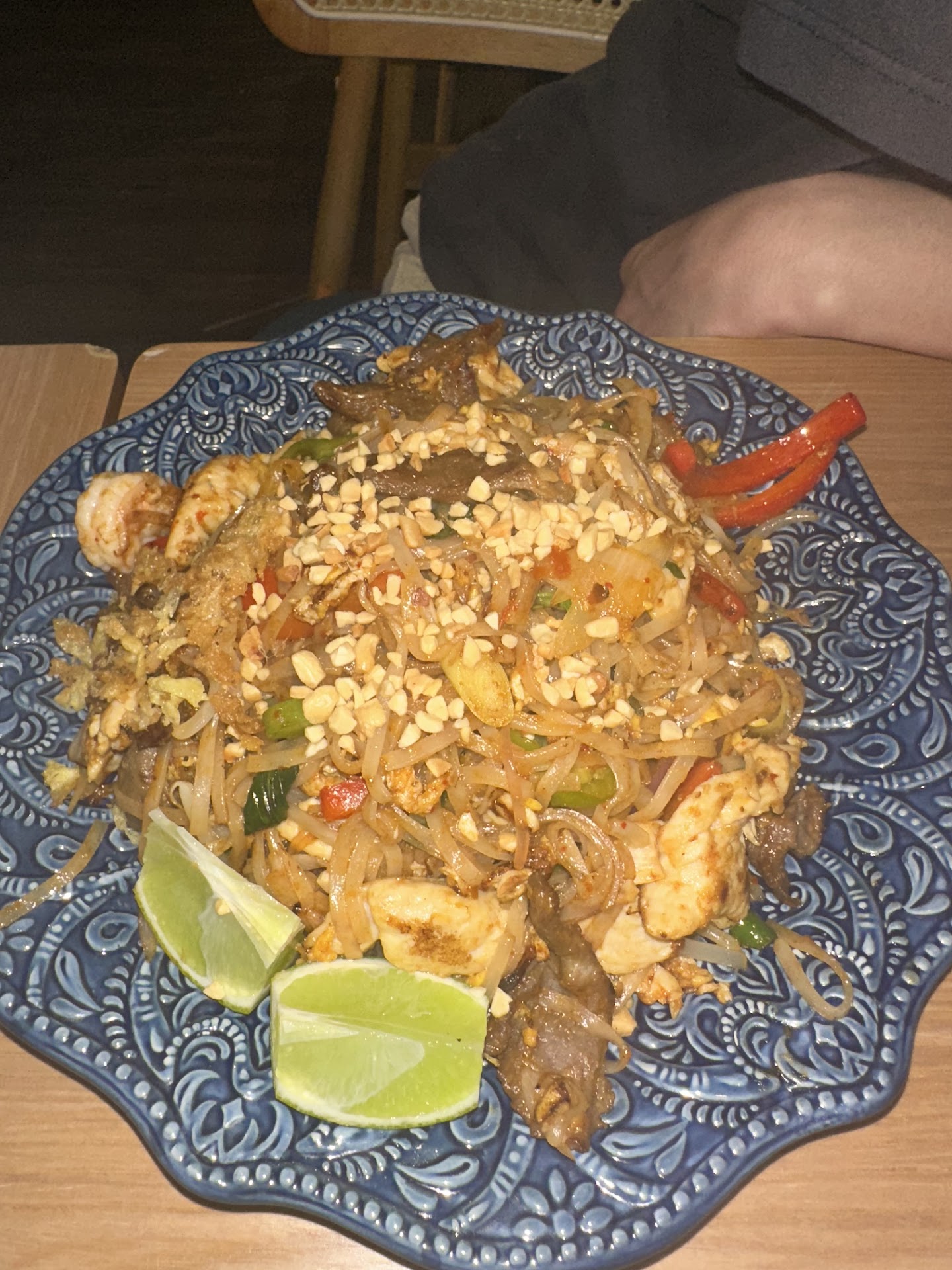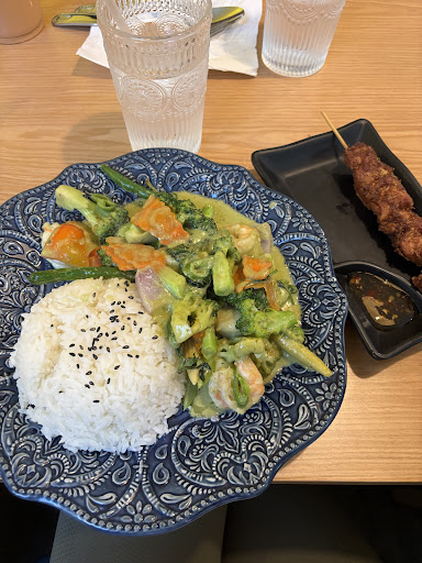 I ordered shrimp green curry and an extra chicken satay. The curry is not authentic at all and by far the weirdest Thai curry Iāve ever tried. Thai curry never has celery and broccoli. It also does not have that flavorful curry taste or the creaminess of coconut milk. Chicken satay is just straight chicken skewer. My friends ordered pad thai and it was just stir fried noodles, nothing like pad thai at all. We came as a big group of 7 so it took 45 minutes-ish for the last dish to be served (still very long waiting time). The restaurant is also understaffed with only 1 waitress running between tables (maybe because of the summer break).