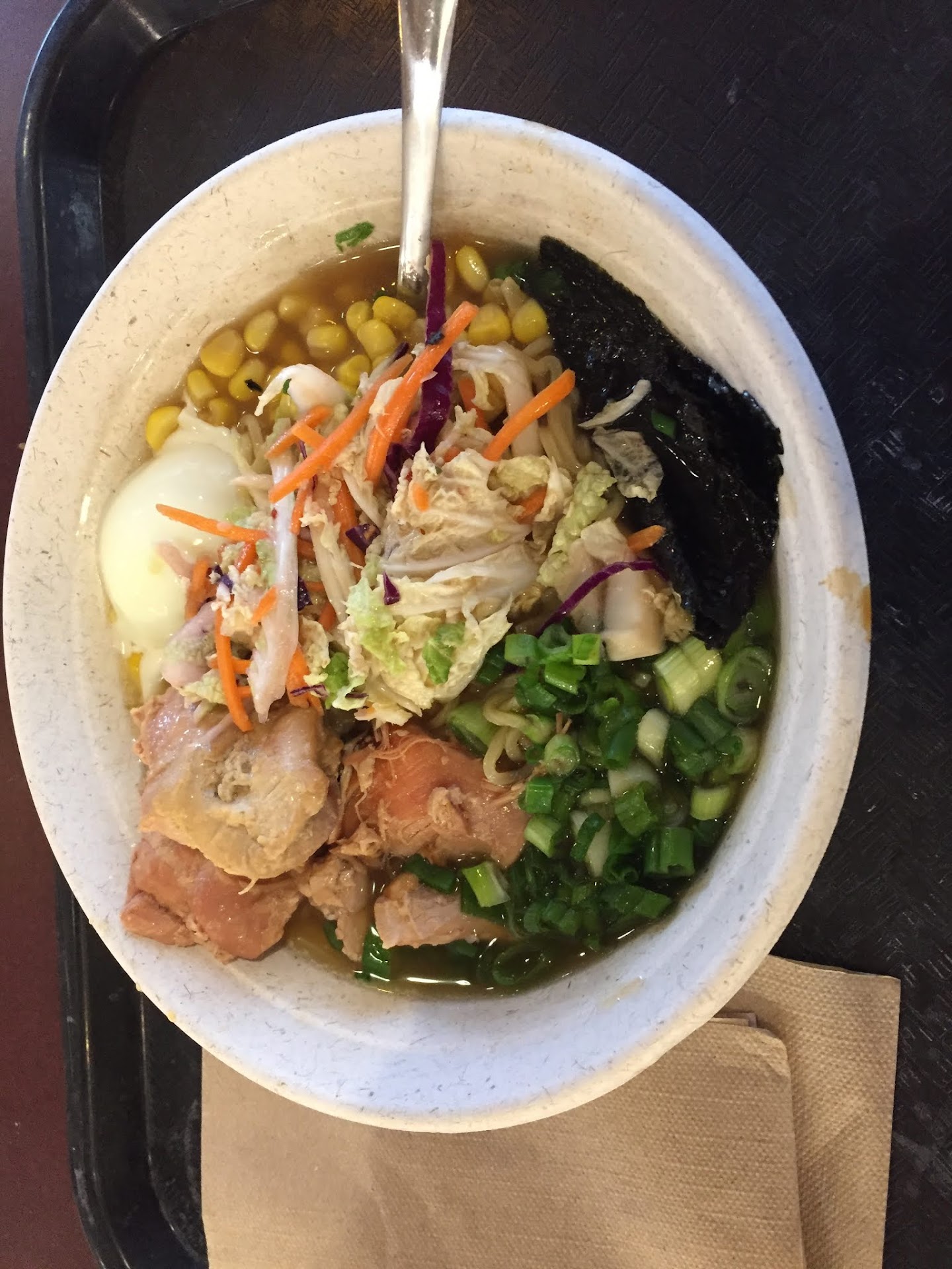 Although there are many options, I wouldn't want to come back here. I've been here twice. The Chinese stall's food was decent. I like that it's delicious but not too oily. The portion is also large. I could easily kept half of it for another meal. However, the chicken ramen that I have just eaten ($9.49) was terrible. Undoubtedly the lowest quality ramen I have ever eaten in my life. My palate for ramen is probably higher than many people here, simply because I had eaten many good ramens in Japan and had cooked some of them by myself. But the taste here is just so sad. There is no dimension to the dish at all. The chicken broth is so bland - and mild as if it has been diluted with the ratio of 1:5 of stock to water. The onsen egg is overcooked. The noodles' quality is the same as that of the cheapest type you can find in grocery store. This noodle might not go so bad with a heavily sauced yakisoba. But with such a boring soup, it has no taste. The chicken isn't too bad. But the texture is so dense that it's difficult to eat. The spring onion is sliced too thick. The Napa cabbage and carrots are so tasteless it shouldn't even be here. The most acceptable thing of this bowl is the canned corns. It doesn't taste much. But at least it doesn't disappoint me.