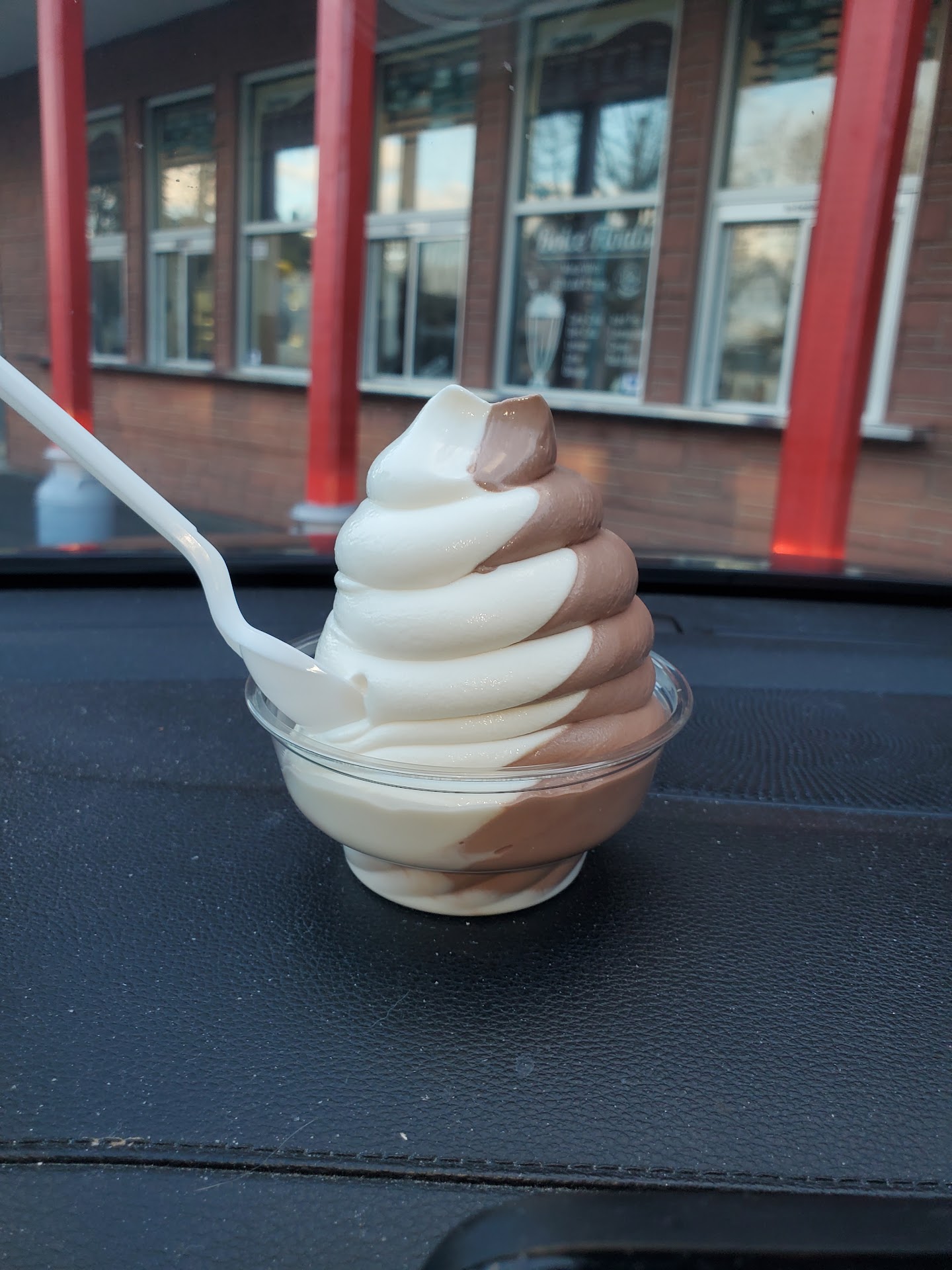 Hey guys. OK so today I decided to give this ice cream store anothertry. It has been 4 years since I was there last and I got myself of an aluminum chocolate twist to start I actually called to see if they accepted credit cards. And she said yes but there is a little bit of feed use the credit card but that's always nice to know because I don't always carry cash on me. Upon going to the store there was nobody at the window so I went inside and there were 2 lovely young ladies and they were very very helpful um I didn't ask if they had the pumpkin soft serve. She said yes and then when she went over she didn't realize that it wasn't frozen yet so I said not a big deal let me just get a vanilla and chocolate because I had to get back during my job. And I was pleasingly surprised. The ice cream that they physically make there was absolutely delicious. It was smooth creamy and I definitely taste the difference in the flavors. The atmosphere was very warm and inviting. And the young ladies were very cheerful and smiling it's always nice to see employees that are helpful and happy in their job I did not get their names but I wanna thank them so much for helping me today. The ice cream was amazing just as I remember it when I was a child.