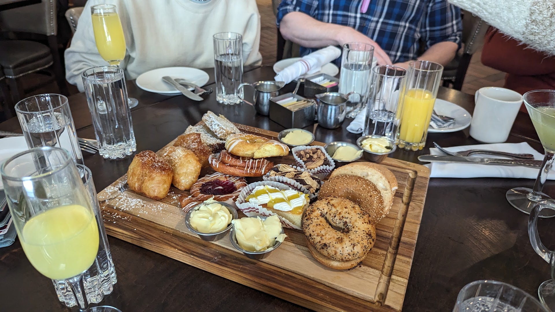 The service was very good. We were promptly seated after locating the hostess station in the rear of the restaurant. Our waitress was very friendly and attentive. Was quick to the table and getting our drink orders. The drinks were not very good. I ordered the maple smoked old fashion that was presented very well but tasted extremely watered down. My wife ordered a martini that tasted very good but the drink size portion was small considering they placed 3 large olives in the glass which occupied a lot of space. Our other two friends had wine and beer which were satisfactory. The appetizers were the pretzels sticks, wagu beef tartare and a spicy tuna roll. All of them tasted very good. The dinners orders were tasty. But came out extremely fast after the appetizers. Unfortunately the portions were on the smaller size for the larger price tags. The lobster pot pie, which was more along the lines of a bowl of lobster bisque with a crostini on top, my Ahi tuna which was a small piece of tuna very nicely prepared served over what tasted like the Cardamom Sticky Rice which was slightly dried out, the burger which was very fairly priced came well cooked with a nice side of onion rings and the Wild Mushroom Truffle raviolis which were very good and a decent portion. We ordered two desserts for the table an awesome ice cream cookie sandwich plate and a dismantled Smores plate which again came well presented but the marshmallow was extremely tough and chewy and had an extremely amount of smoke flavor which slightly over powered the dessert. Over all the restaurant was a busy bustling restaurant with a very nice ambiance. The bar appeared to be very crowded as we entered. We left feeling the food tasted ok, nothing spectacular, but nothing horrible. The pricing was definitely high especially for the special drinks and has a very NYC atmosphere. We felt that while the service was good it was a bit rushed considering we literally sat, drank, ate apps, dinner and dessert under 1.5 hrs. Basically we still had apps on the table and the dinner arrived. It could be slowed down a bit. Average experience for the above...