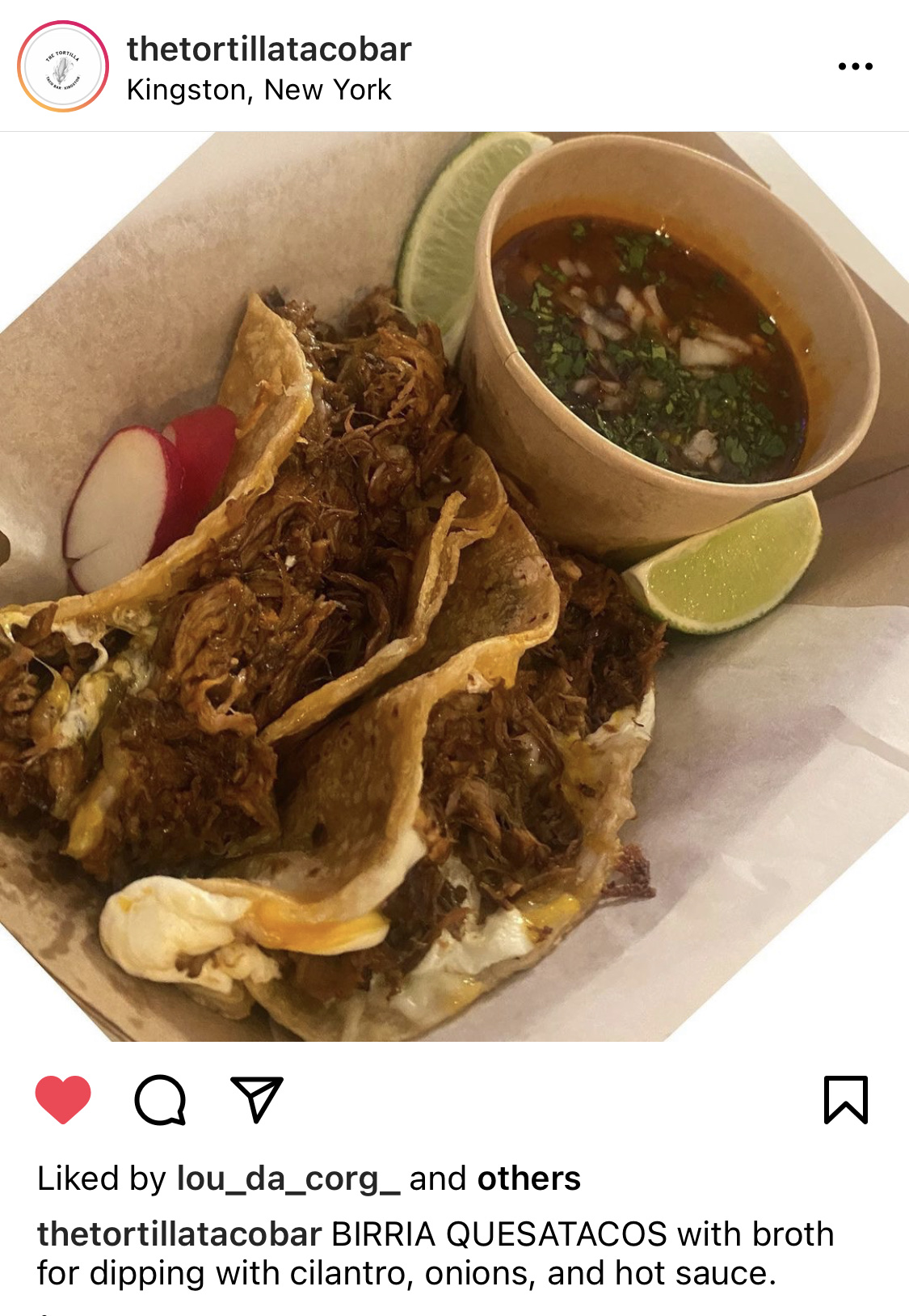 Lovely new spot in the historic waterfront area of Kingston, NY. They’d planned to open last spring but COVID delayed their launch until summer; they’re preparing delicious burritos, tacos, tortas, quesadillas, vampiros, rice bowls and elote street corn. Having just read about the ‘birria boom’ in the NY Times earlier this month, I was thrilled to try their birria quesatacos (see their IG post below) - absolutely delicious with a very tasty broth to dip with & drink. They’d originally only made it on weekends, but it’s proven so popular that they have it on the specials menu daily now. The owner also knows his way around some excellent mezcal from Oaxaca in Mexico (see their IG post below), and offers flights to sip with the traditional orange slice and Tajin chile & lime seasoning... he also makes a mean house margarita as well. Delicious new spot, and great people. Will definitely be back! Oh yeah, note they don’t actually deliver, so reviews talking about delivery aren’t being fair. You can however pick up take-away (with...