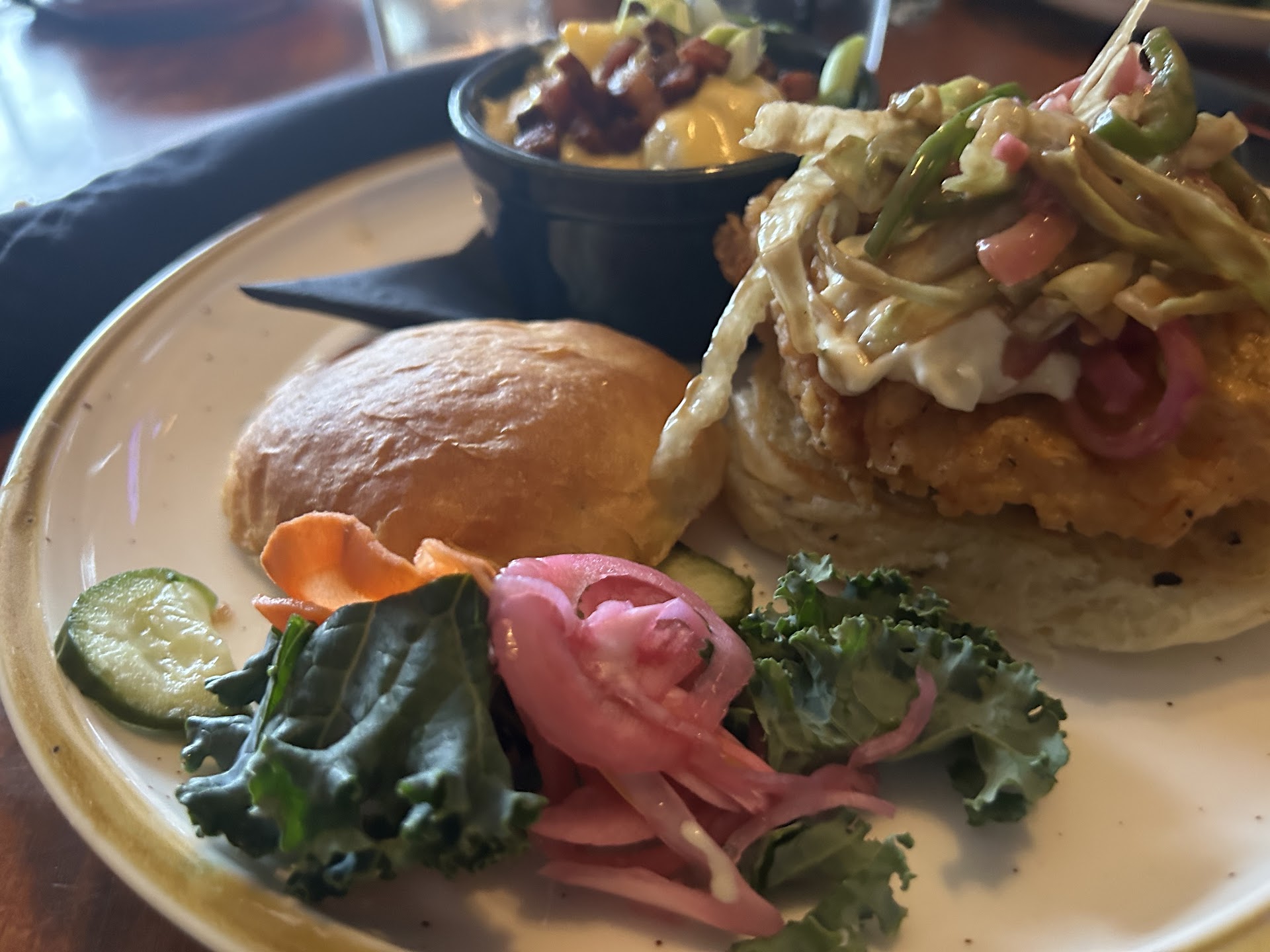 The food knocked me off my socks. I am rarely impressed with food since I cook a lot, and make everything home made from pasta to bread to sweets- but this place blew me away. EVERYTHING is home made- the bread, BBQ sauce, paper thin delicious pickles, and they grind their own meat for the burgers! The menu is small enough that you are not overwhelmed, and you know that everything is made with love and care. I had the mussels in what I can only describe as magic sauce- it was the most delicious mussels I've ever had in my life. Huge chunks of thick bacon floating in a garlicky, beer, rum based broth. They even gave me a spoon for when the bread was done and I had nothing left to dip. I could die for those mussels. Next was a burger- classic, with bacon, cheddar and onions. The burger was HUGE- almost too huge to bite, but I managed! The bacon was so thick, and the onion were piled on high. It's one of the best burgers I have ever had in my life. The fries, which normally I wouldn't think twice about- were amazing. They kept the skins on the end, and they had just enough salt-I hate it when my fries have no salt. This did not disappoint. My neighbor ordered Kiki's Potato salad- holy cow. It was cheesy, gooey, and incredible. I haven't tasted anything like that.