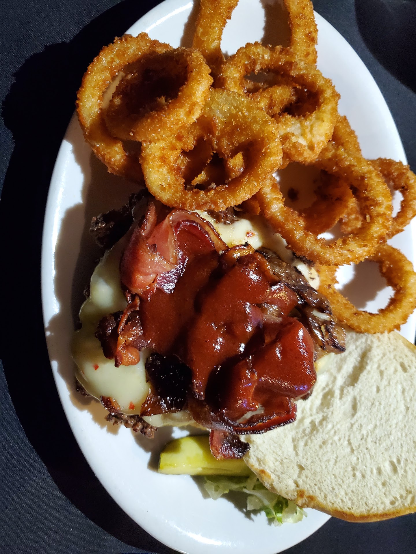 Read moreThe service was my first impression and I would give it 3 out of 5 stars. Our waiter didn't ask if we were ready to order for a while. Once she dropped off the drinks we had our menus down ready to give our order and she said she had to run food and she'd be back for the order. Well we waited a while. Once our order went in the food came out efficiently. Drink refills happened in a rush and she didn't clear the empty glasses. We were already placed at a table for two with three people in our party so it was frustrating. Plus they give you water glasses to start wether you ask for it or not. So with one refill each we had nine glasses at our table. I got the rodeo burger cooked medium temp. Bravo cooks :) it was cooked perfectly. The flavor of the BBQ, caramelized onions, cheese, and meat was sweet and savory. I got onion rings on the side. They are perfect too. Crunchy and just the right size. My fiance got the pulled pork nachos. He said the pulled pork was super sweet and delicious. Don't plan to get this meal in takeout though. It won't taste the same. You have to eat it after it was prepared. My daughter got medium boneless wings. She wasn't as happy about her meal. The wings has almost no sauce and medium is more like mild. I blame myself for this one. We should have asked for extra sauce on the side and about the heart...