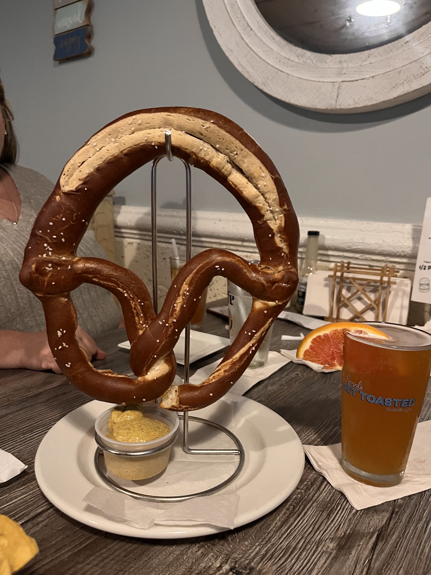 We started with a big pretzel that was soft and tasty. The mustard dip was tangy and good, and the cheese sauce was simple but worked. The artichoke dip came in a bread bowl, and honestly, that bread bowl was amazing - it had a crispy outside, super soft inside. The dip itself was solid, and even though the chips didnât have salt, it was still good overall.