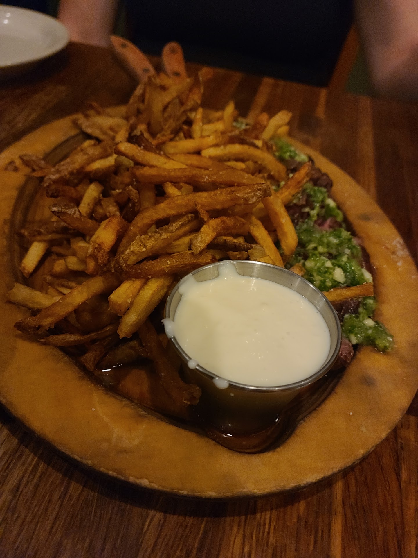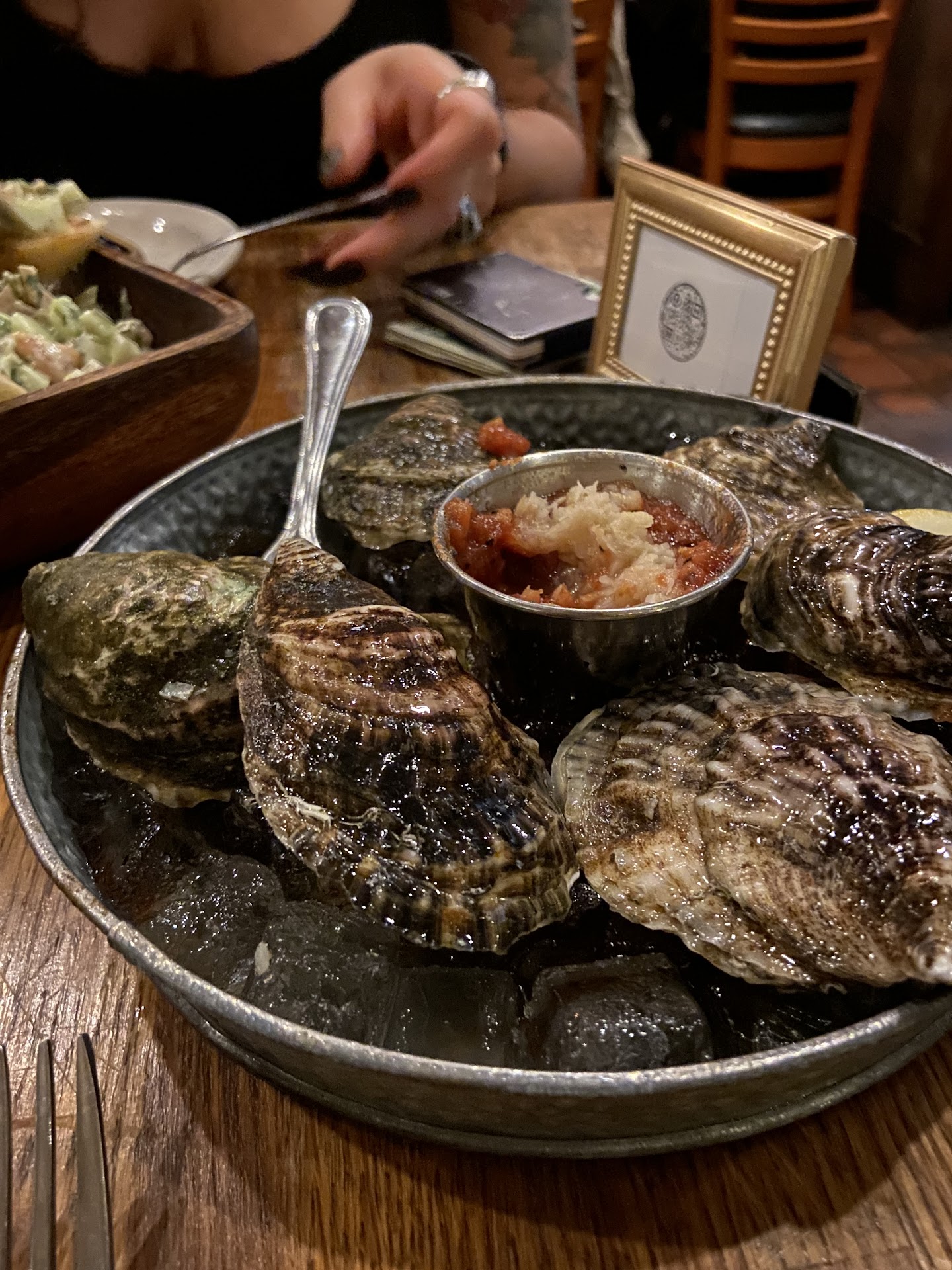 We started with the raw oysters, which were very fresh. The cocktail sauce had some great taste to it. Then we moved on to the whitefish dip. Wonderful creaminess and robust flavor to it. The bread that came with it was fresh and was toasted to perfection. There was so much dip that we could have used a little more bread, but that wasn't a problem at all. For the main, we got the steak frites. The chef prepared the steak exactly as we asked, medium rare. The hanger steak was tender and flavorful, and the sauce was strong....