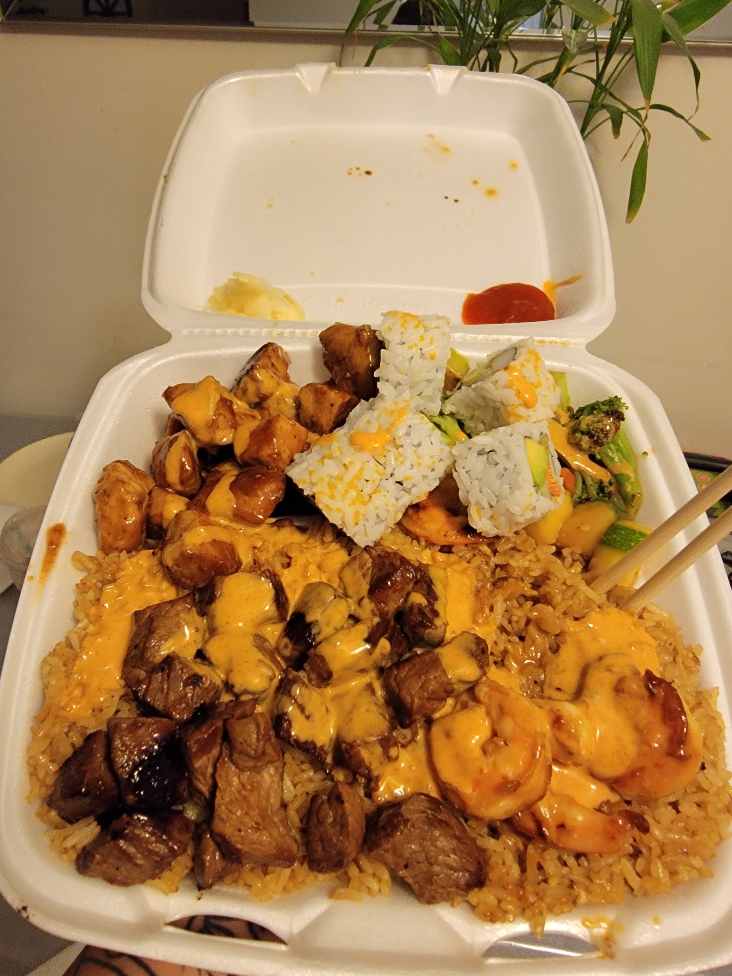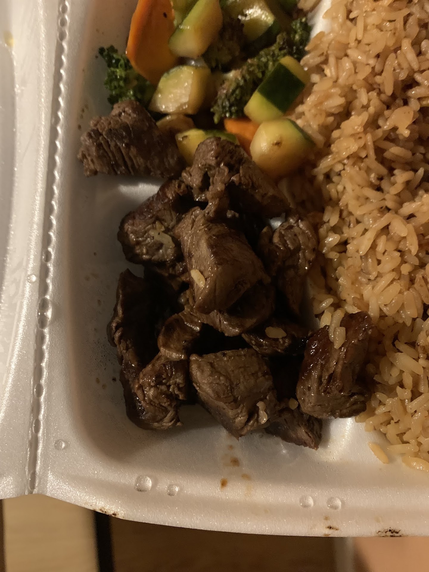 Read moreSo, my lovely wife got some food from this place for the entire family. It was okay, never had fried sushi 🍣 before and it was new and delightful. However, my combination plate of egg fried rice and chicken and steak was in need of moisture or less cooking. I thought it was okay over all but thought that we might have caught them on an off night. I always give a place at least two chances to show out on how good they can be but this second visit was enough for me. We went back and this time I purposely ordered the filet mignon because I wanted tender steak with the usual egg fried rice.I ordered it medium and let me add, I’ve eaten and made my own steaks for years, I know which cut of steak is what. They gave me the same regular tough steak they sell instead of the filet mignon and to add insult to injury they only gave half the portion of meat than the combination plate comes with. This sad dish was still dry and just as over cooked as the first time I ate there. The rice was just as dry and seems to me like they keep all of their fried rice in some sort of warmer and is never really made fresh to order. Over all I’m just not impressed with them or their bait and switch tactics with the meat. Would have given no stars but I ate my food and the veggies were good plus this won’t let leave zero, so one generous star from me I guess. Buyer beware!