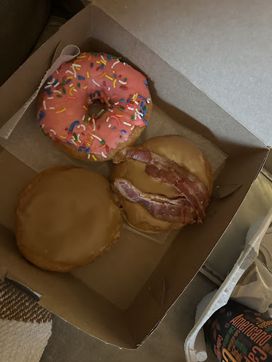 I ventured in to view the selection just before noon and found trays filled with a variety of treats. More than just donuts, the other bakery offerings looked tempting, but I was there for the real deal. I opted for the Fruity Pebbles donut (gooey and chewy with, sweet little fruities) and the Maple Bacon donut (same deliciously doughy texture as the Fruity Pebbles donut, but with maple frosting and sweet bacon hunks on top). I savored each bite and left satisfied, but not overly-indulged.