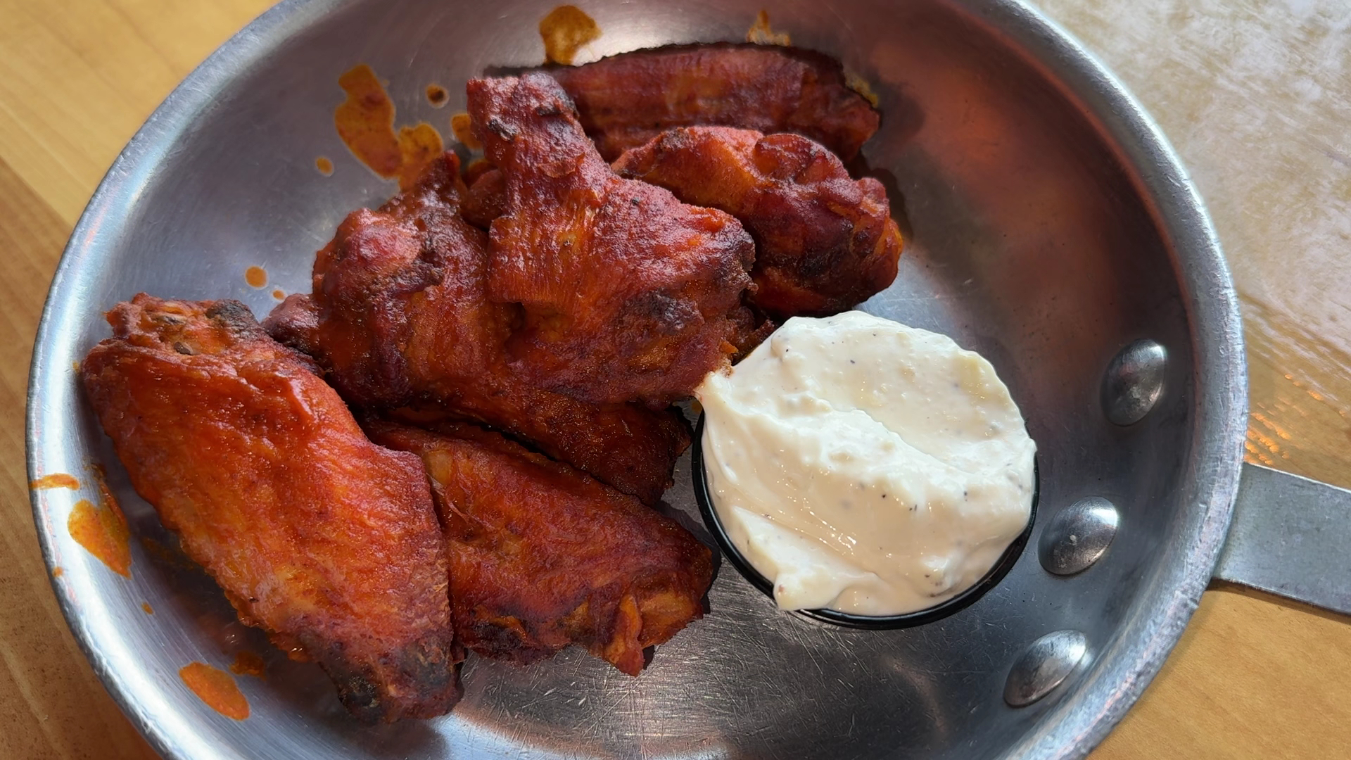 The buffalo wings were cooked with precision—baked first, then fried, and tossed in a bubbling pan of red hot sauce over a flame, with butter added at the end for that smooth finish. Paired with house-made blue cheese that was thick, rich, and anything but watery.