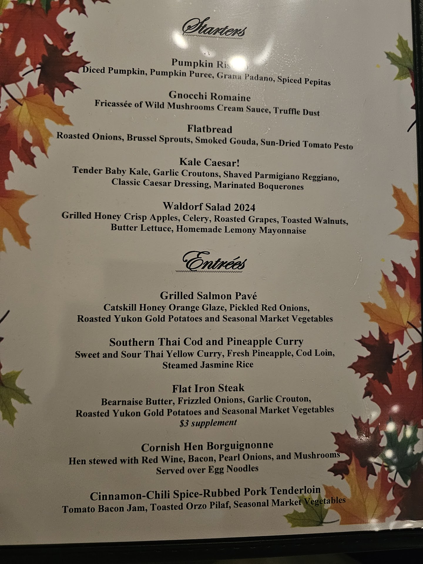 The menu changes twice each term, each a very reasonable prix fixe including starter/appetizer, main/entree, and dessert.