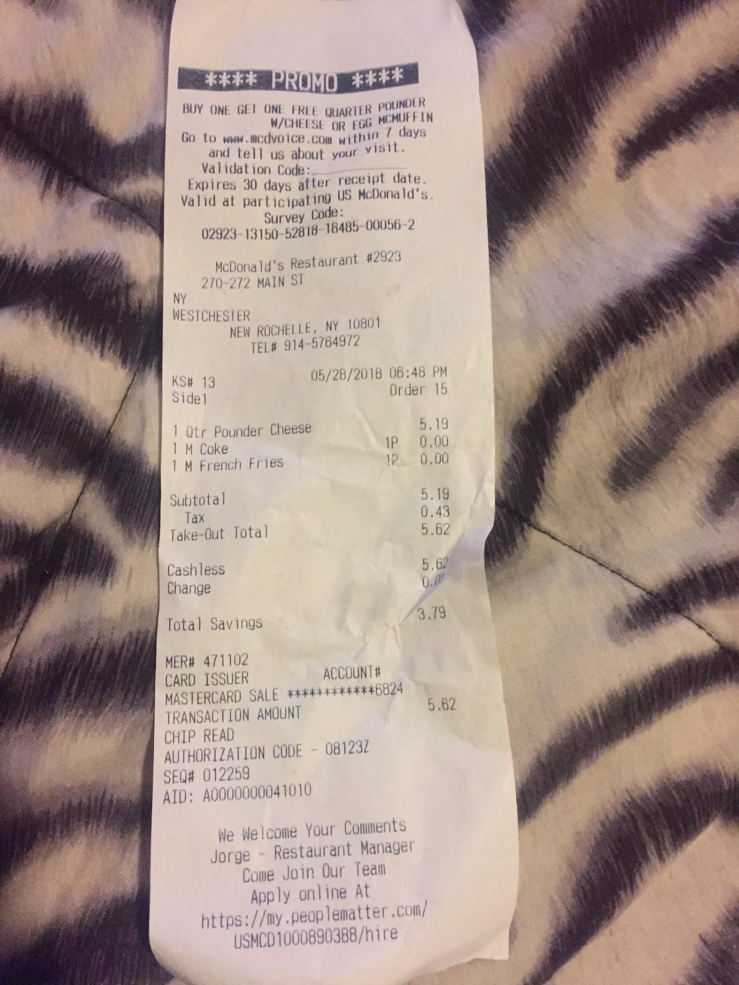 Read moreThe food was good, don't get me wrong. It's just that the Main Street McDonald's in New Rochelle here is bad for both its service & presentation. How so? Because the cashier on duty (4am on 4/26th, 2019) was just incompetent & insensitive! Why is that? Because she didn't take our order seriously enough, if at all. We ordered 2 sausage mcmuffins & 4 PC chicken tenders, & yes we had told her in Spanish (she only spoke Spanish). She instead charges us extra for a sandwich that we never ordered, but we took that & the rest anyway. She then tries to confiscate the sandwich (when we're at the table!) but it was already too late. I earlier said I wanted 4 pieces of tenders but instead I get 5 & they're all burned to a crisp! Now the worst part was that she even had the nerve to put eggs & cheese on the Mcmuffins. The problem is that my 2 associates were allergic to eggs & cheese respectively & they almost had a negative reaction right on the spot. No, they didn't eat either topping. They could have though! On top of that, the bathrooms were filthy as the human waste itself! Heck! Just earlier in the night, I used a bathroom in the nearby Radisson hotel & the toilet was literally covered in fecal matter & piss! Not just on the inside either! So I complained to the front desk & I was informed that they can't afford nightshift maintenance! My workplace has a nightshift maintenance crew & our bathrooms are never as dirty as that hotel's for that 1 night! My final complaint is the fact that I saw 3 hobos sleeping at & even on top of the...