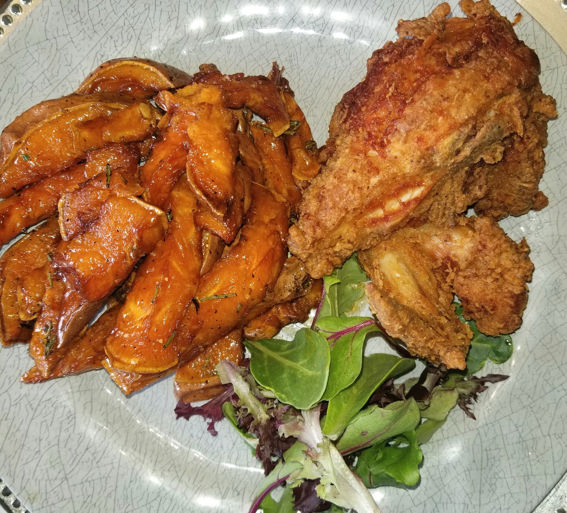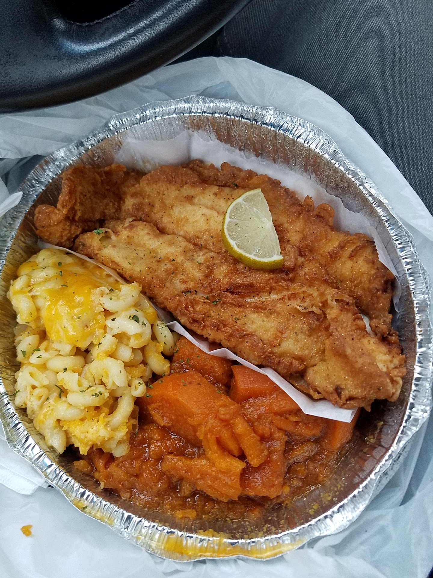 I've been here about three times now, each time for pick up only. The food has been consistent for me. This most recent visit, I got the southern fried chicken, the Mac and cheese, the candied yams, corn bread and the potato salad and both the sweet potato pie, and a banana pudding for dessert. I wanted to see if items I tried before tasted any different. Well, I for sure am definitely not a fan of the potato salad. It just is something I should have known not to get. The candied yams actually tasted better than when I got them the first time. The chicken was still good, although they didn't serve those huge pieces like before. I guess the recession is hitting everyone, and the inflation has gotten back to the chicken 😩. I think the mac and cheese also was better if not about the same. The sweet potato pie wasn't all that for me which again is weird based on the restaurant name. We ordered two pies and one was a pie like you'd get at your local chicken spot and the other was a pie slice. The banana pudding was good, though. Also, I did try some of the collards with smoked turkey and that was really good. I would get that next time. Oh, also, there's a cash discount but you don't find that out until after you pay so you pay the total given then you get change back and THEN they tell you about the discount. In all this time, the experience was 4.25 or 4.5 stars but...